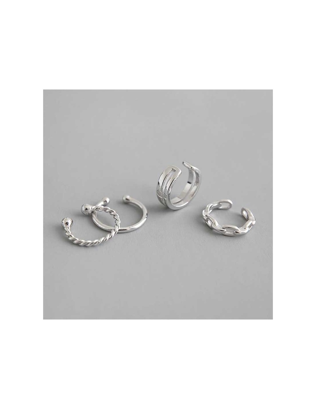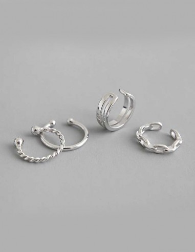 Lot de 4 boucles d'oreille en argent 925 à passer autour du pavillon sans avoir à le percer. Chaque anneau est différent : un simple, un tressé, un en chaîne et un dernier à deux bandes.