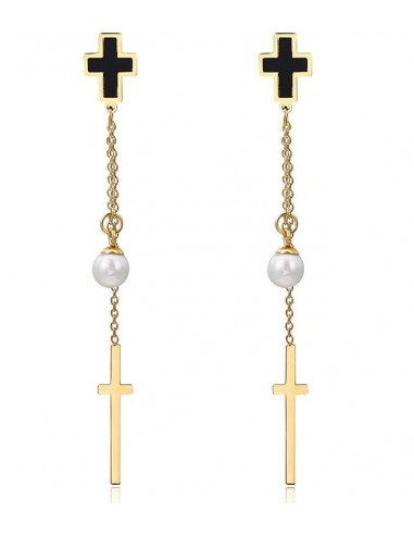 Boucles d'oreilles pendantes avec perles blanches et deux croix dorées dont une vernie de noir. Bijou en acier inoxydable plaqué or 14 carats.