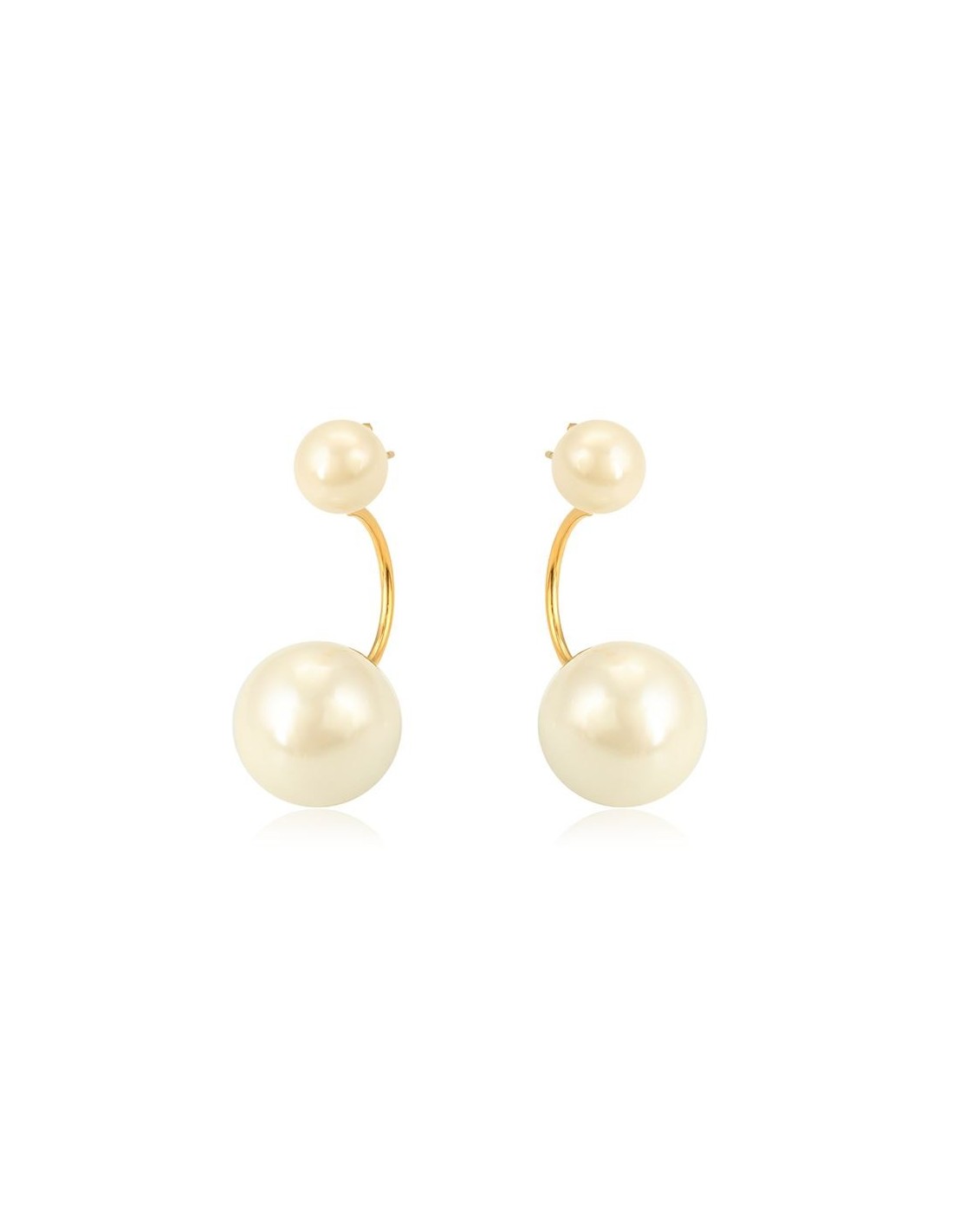 Boucles d'oreilles en acier inoxydable plaqué or 24 carats avec doubles perles blanches nacrées. L'or et le blanc nacré se marient à merveille pour donner un effet lumineux qui embellira délicatement le visage.