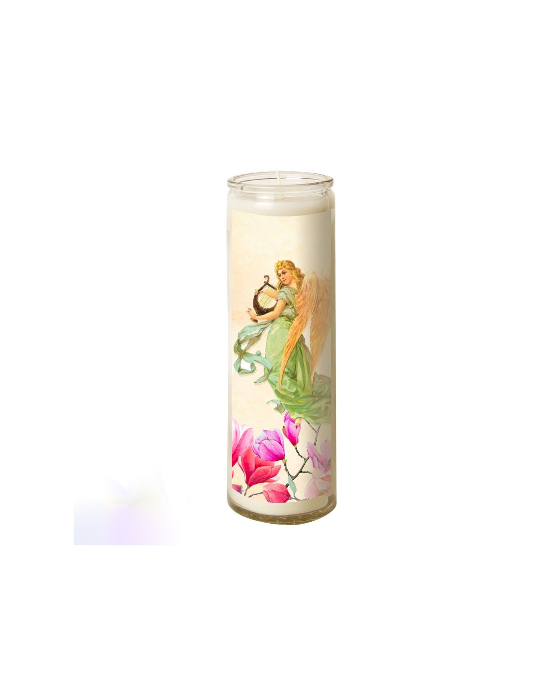 Avec l'image d'un ange vintage jouant de la lyre entouré de fleurs en décoration, cette bougie peut être utilisée pour la prière, la méditation, la décoration ou encore l'ésotérisme.
