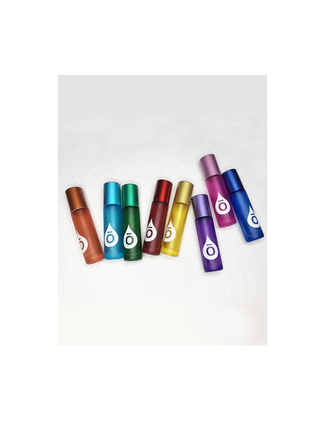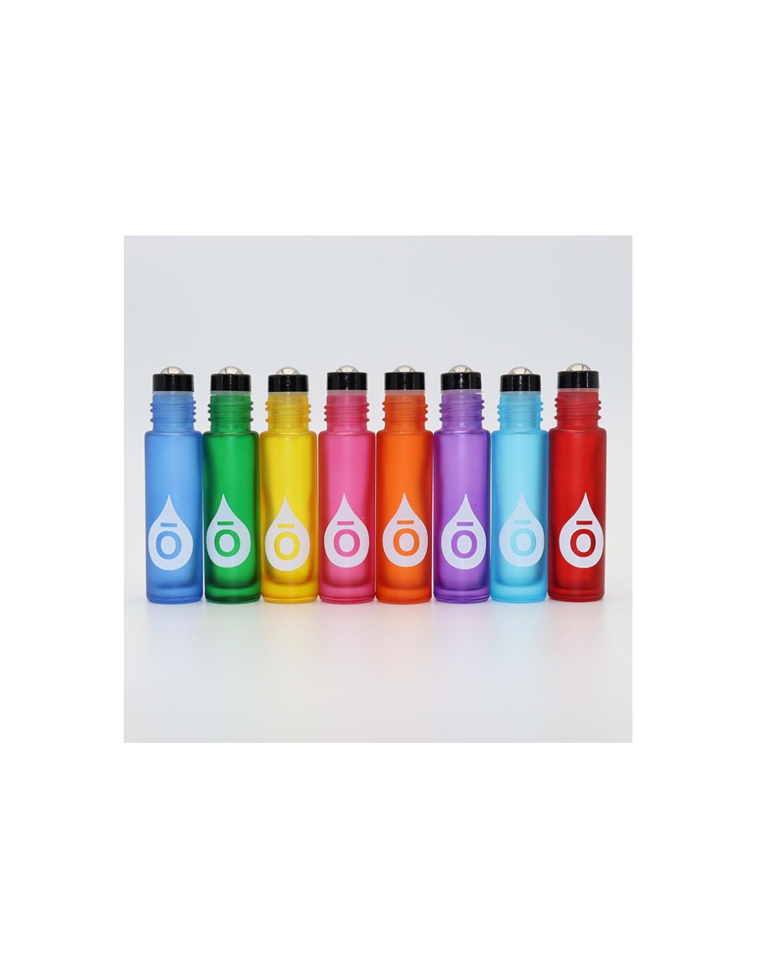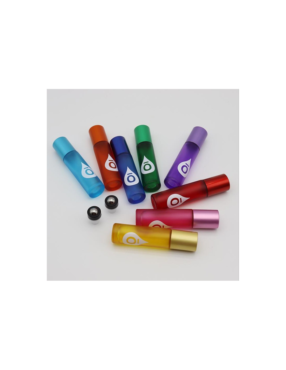 Bouteille en verre fumé de couleurs variées, avec bouchon en métal et bille roller. Vendues par lot avec mix de couleurs : rouge, mauve, bleu, rose et orange.