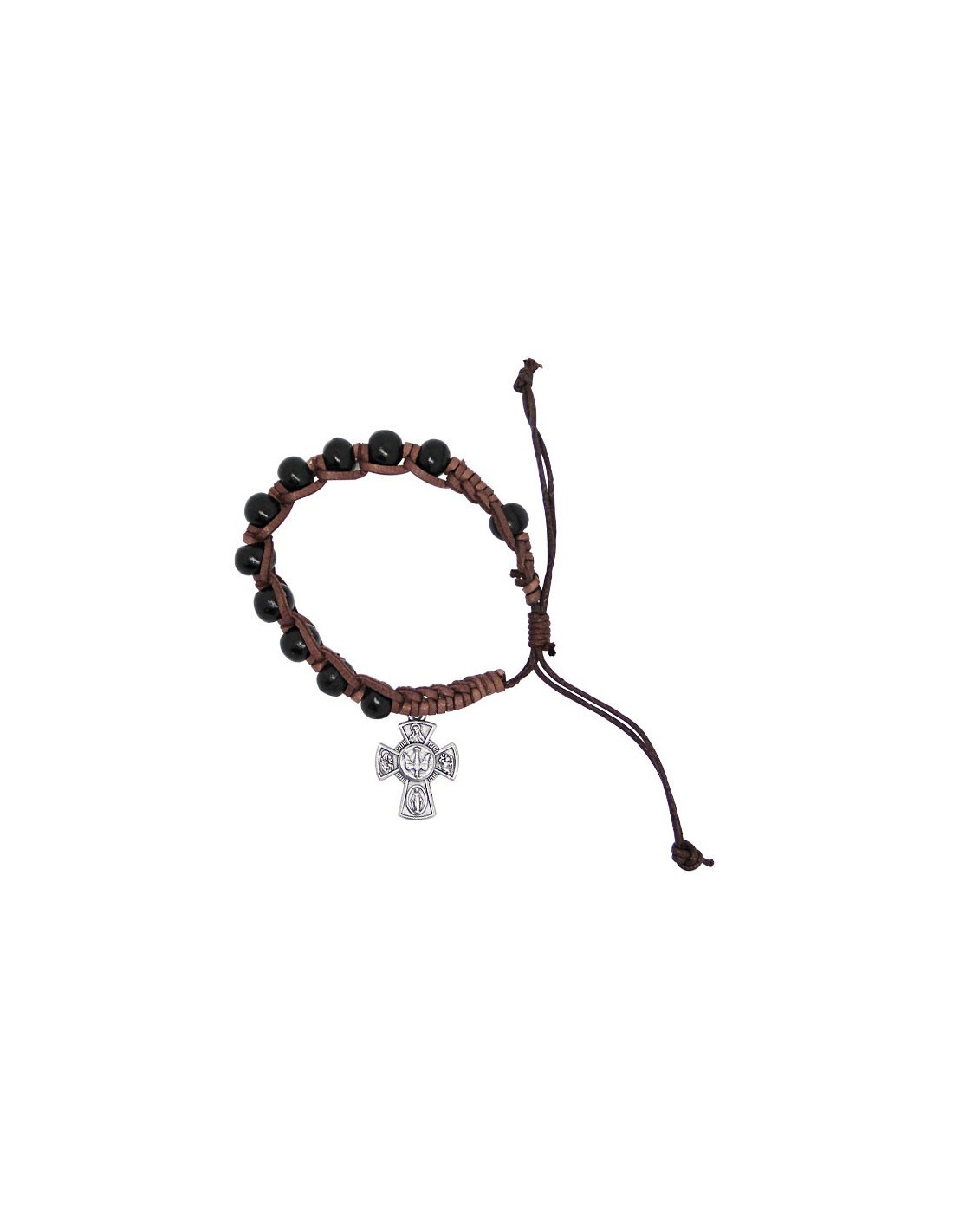 Bracelet en bois noir dizaine avec croix Saints protecteurs - cuir brun