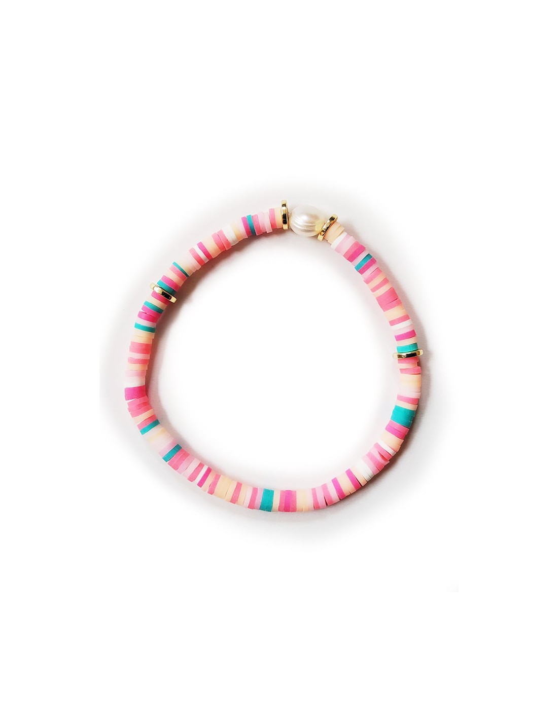 Joli bracelet bohème aux tons roses fluos, évoquant une une délicieuse barbe à papa. Réalisé à la main par des artisans, il est composé de petits segments de pâte polymère et agrémenté de quatre perles dorées et d'une perle d'eau douce dont la blancheur nacrée se marie parfaitement avec le mélange multicolore du bracelet.