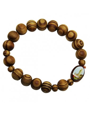 Bracelet élastique aux perles en bois naturel, pouvant servir de dizaine grâce aux perles plus petites qui servent de repères. Le bijou est orné d'une image de l'Apparition de Lourdes.