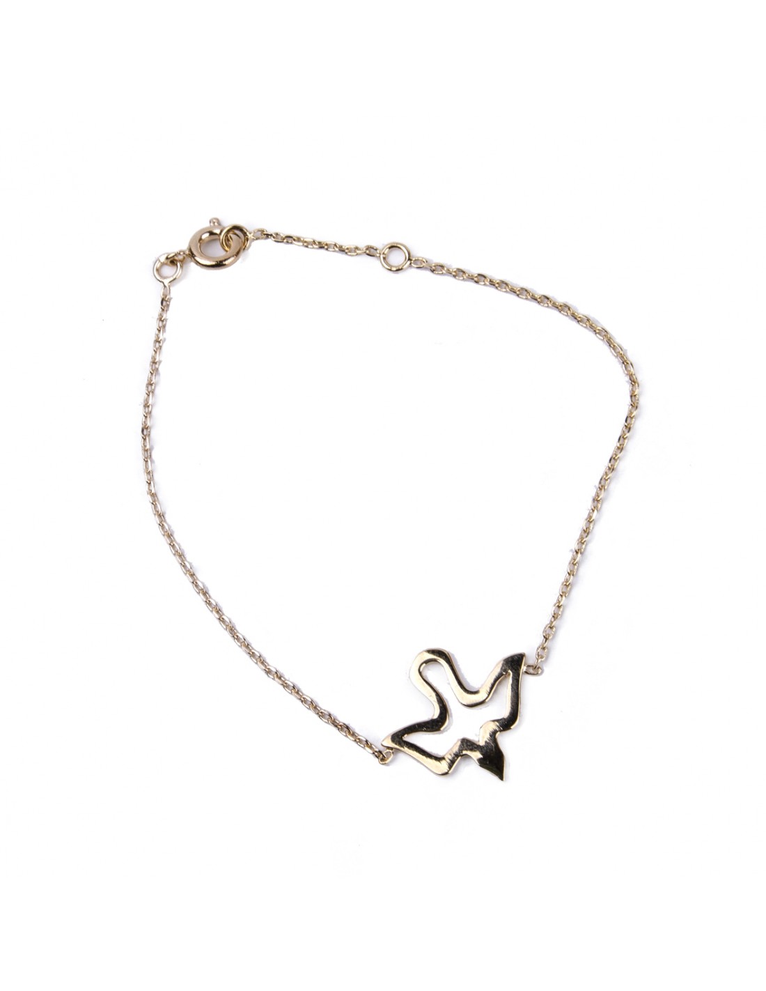 Bracelet en plaqué or avec une colombe. Le pendentif représente la délicate silhouette de l'oiseau en vol. Un bijou esthétique et bohème. Le mousqueton a deux positions de fermeture.