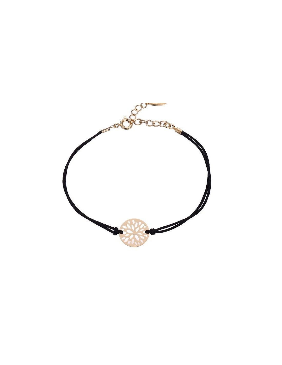 Bracelet à cordons noirs et perle gravée. La perle, pièce principale du bracelet, est gravée pour ressembler à une fleur aux multiples pétales. Les pièces métalliques sont toutes en plaqué or 18K.