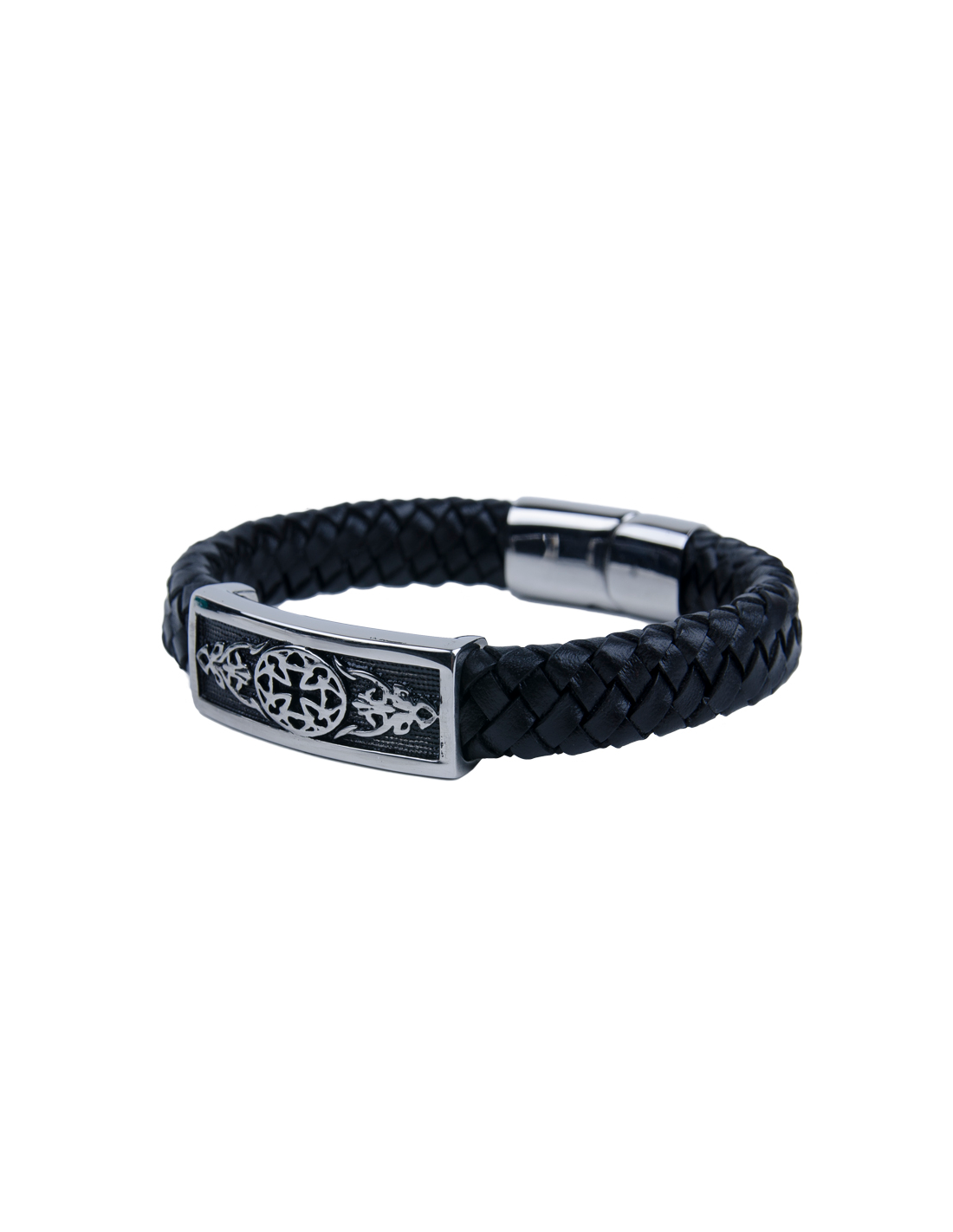Bracelet en cuir noir tressé pour homme, orné d'une breloque en métal gravée d'arabesques.