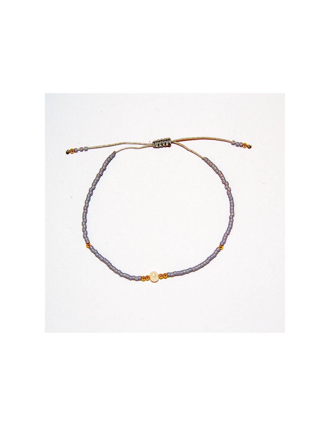 Ce bracelet délicat et fin est orné en son centre d'une véritable perle de nacre, elle-même encerclée par des perles dorées qui la mettent en valeur. D'autres perles dorées parsèment élégamment le fil du bracelet et ses extrémités telles des touches lumineuses pour égayer l'ensemble. Le nœud en macramé fait une sorte d'écho à la perle de nacre et les fils volants agrémentés de quatre perles ajoutent un côté léger et subtil.