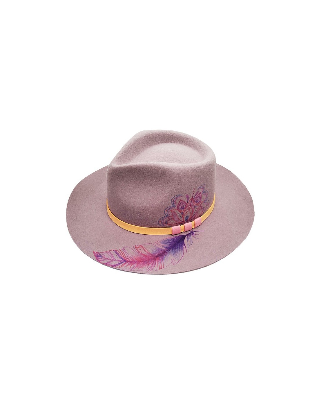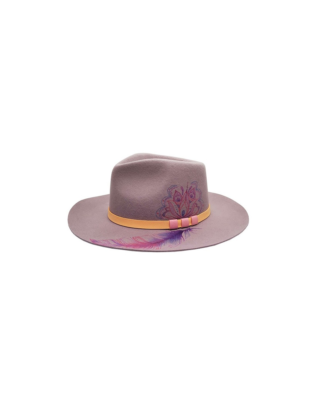Le chapeau fedora est un classique indémodable du style bohème chic ! Ce modèle en feutre de printemps est customisé d'une plume bohème et d'un mandala sur fond violet lavande clair avec une languette en daim orange clair décorée de trois carrés roses.