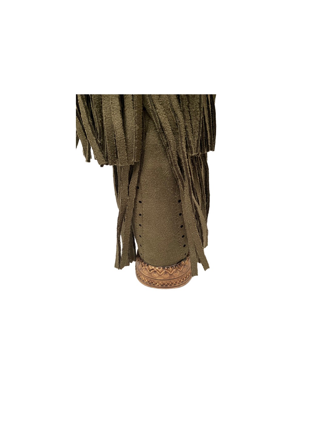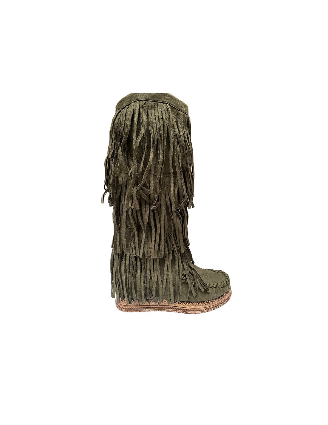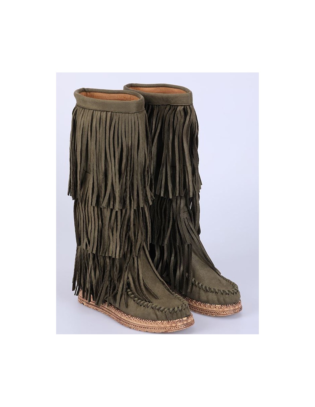 Bottes à franges vertes 100% faux cuir. Ces Minnetonkas sont d'un style bohème assumé parfait pour la mi-saison et la saison froide ! La botte est avec un talon qui surélève le pied, caché dans la botte.