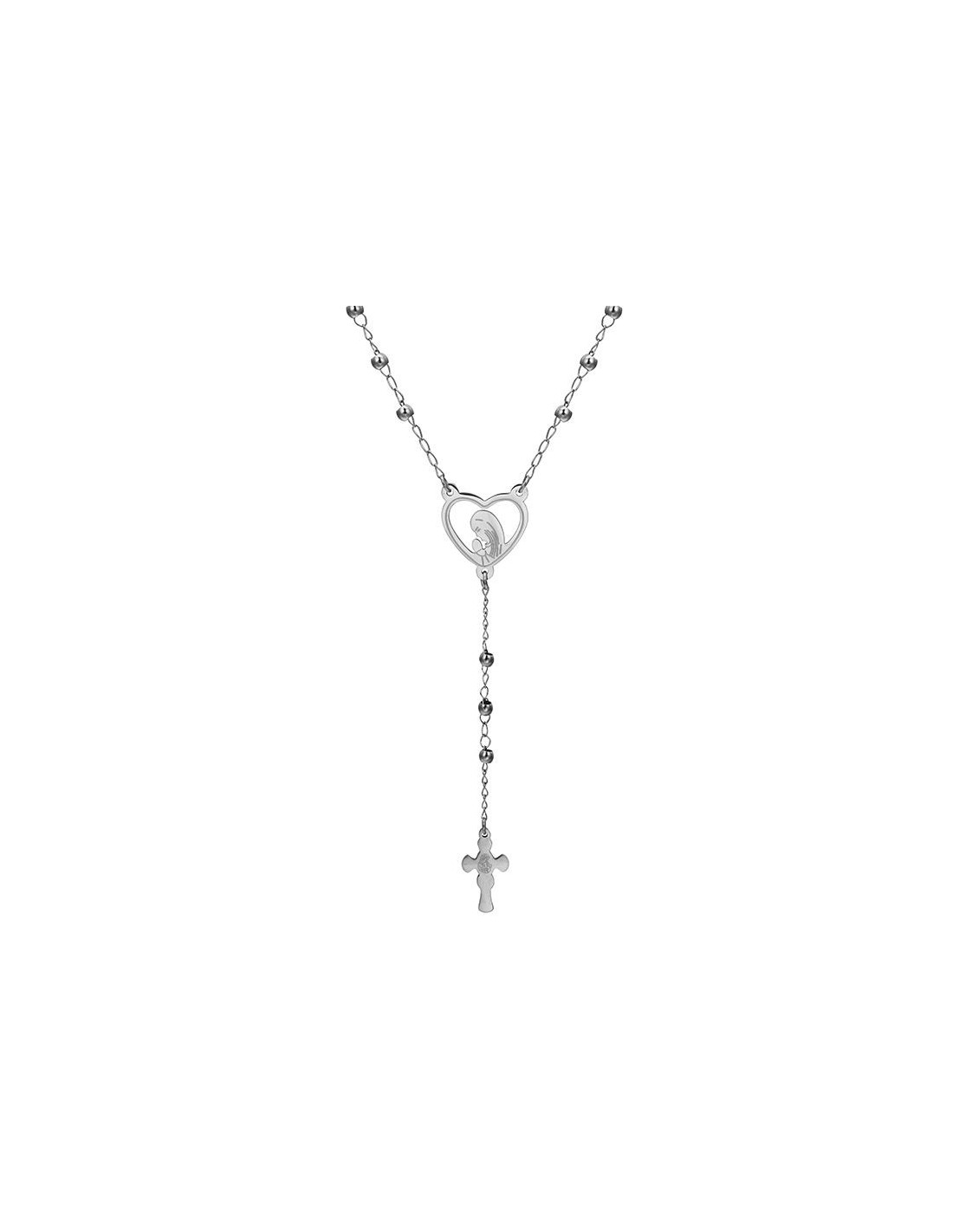 Chapelet en acier inoxydable, pouvant aussi servir de collier de 56 cm de long. Les perles spéciales sont des petits cœurs argentés et la pièce centrale une Sainte Marie en train de prier.
