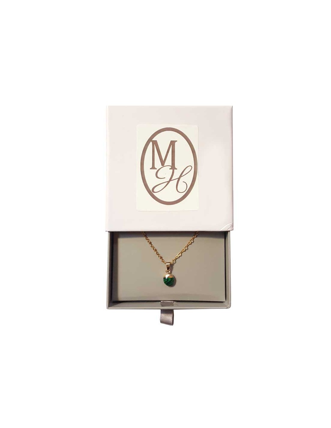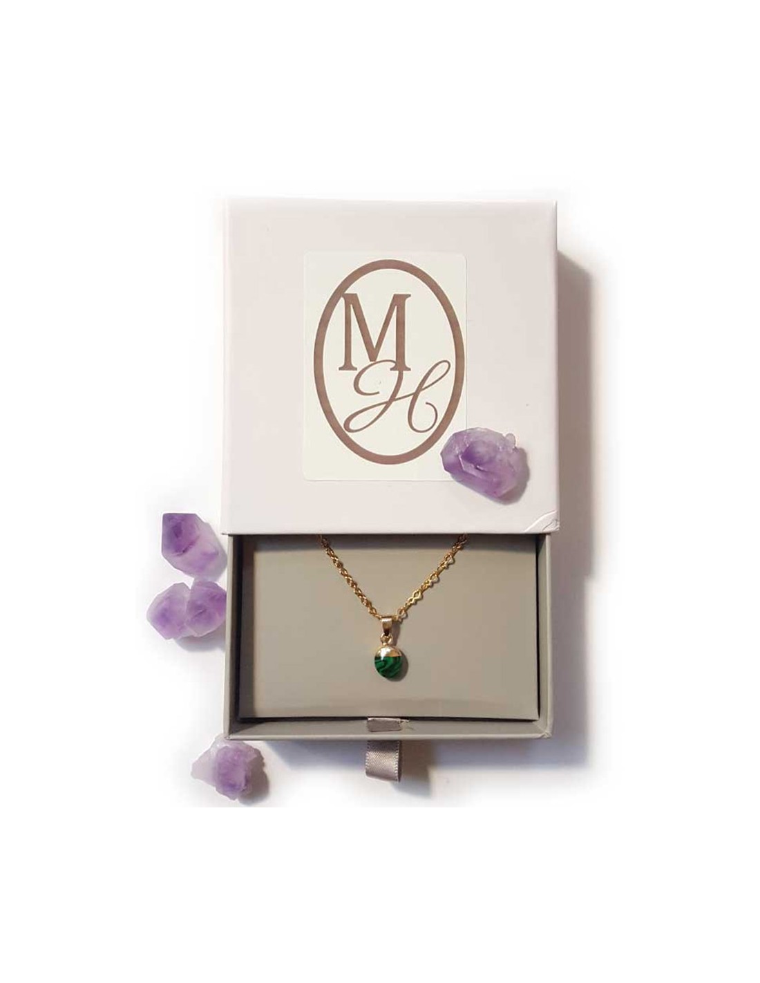 Ce pendentif en malachite est discret et charmant. Plaqué or au sommet, la pierre synthétique est délicatement taillée en forme de goutte et facettée. La chaîne en plaquée or est fournie avec.
