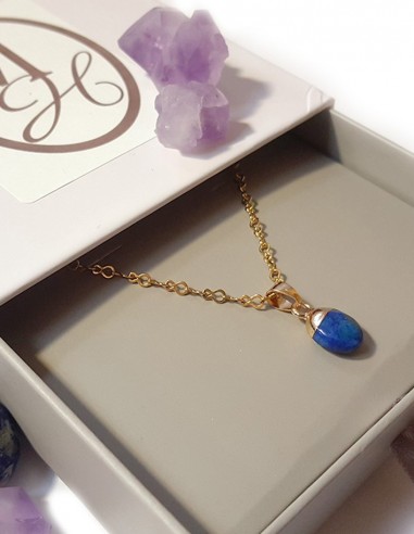 Ce pendentif en lapis-lazuli est discret et charmant. Plaqué or au sommet, la pierre est délicatement taillée en forme de goutte et facettée. La chaîne en plaquée or est fournie avec.