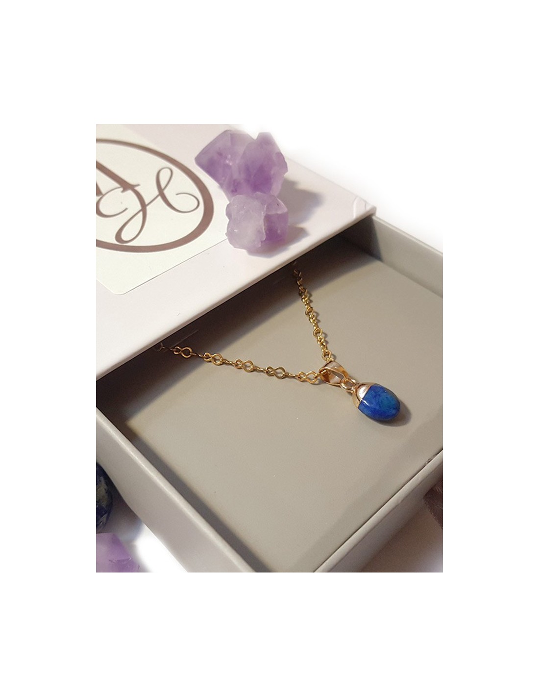 Collier avec pendentif en pierre de lapis-lazuli, taillée en petite larme facettée. La chaîne fournie avec le pendentif est disponible en plusieurs modèles.