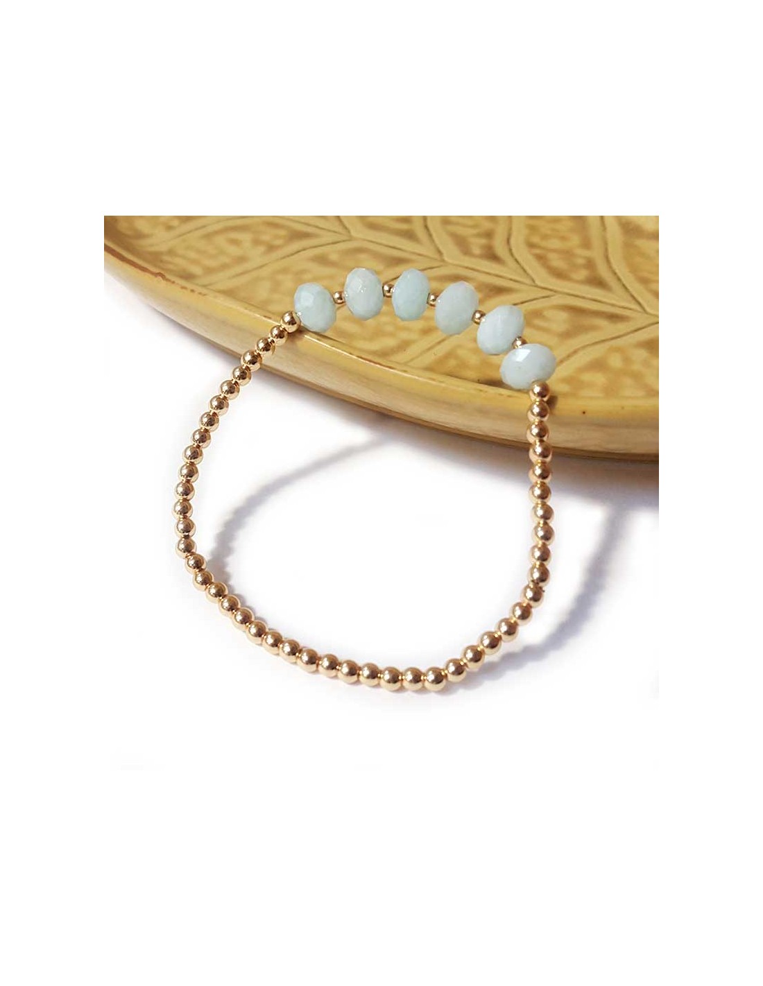 Bracelet à perles dorées et six perles d'aigue-marine facettées. Tendance et discret, c'est un bijou lumineux qui apporte une touche de naturel.