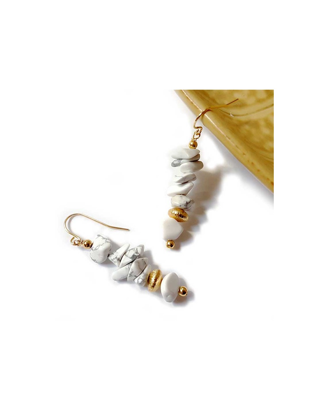 Boucles d'oreilles pendantes rocailles dorée et howlite