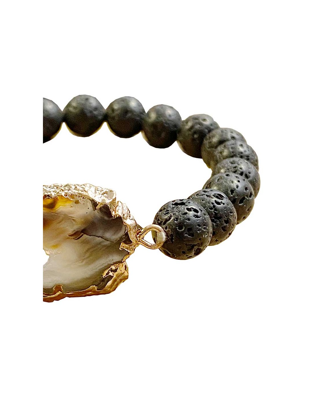 Bracelet élastique en pierre de lave et tranche d'agate naturelle. Les pierres ponce sont taillées en perles rondes et douces. L'agate est peinte d'or sur ses bords, mettant en valeur ses cristaux.