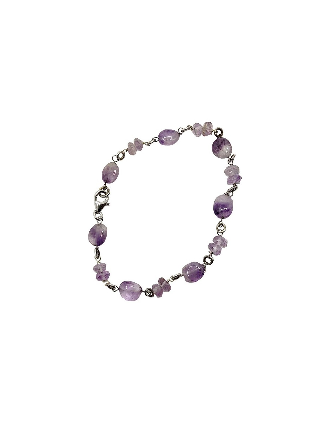 Bracelet en argent 925 avec perles en améthyste. La pierre, tantôt roulée tantôt taillée, est placée en alternance pour un joli motif de formes.