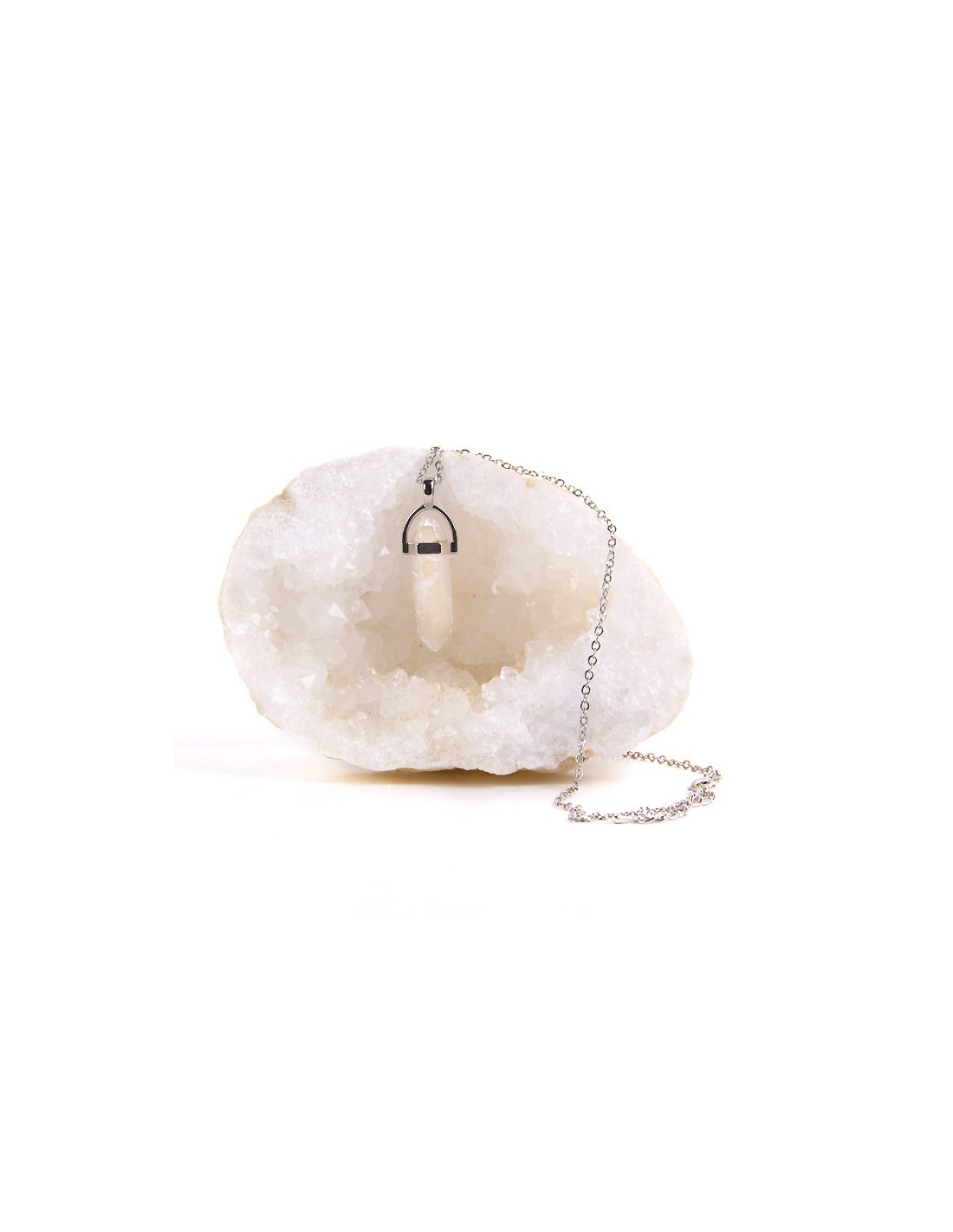 Collier en métal argenté avec pierre de cristal de roche en pendentif.