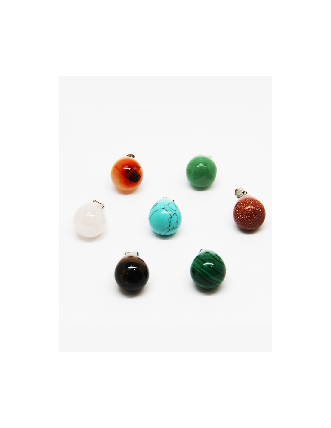 Ce collier est fourni avec 7 pendentifs en forme de petites gouttes. Les sept pierres sont de la cornaline, de la gold stone, de l’œil de tigre, de la malachite synthétique, de l'aventurine verte, de la turquoise reconstituée et du quartz rose.