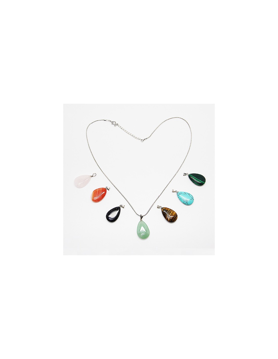 Ce collier est fourni avec 7 pendentifs en forme de petites gouttes. Les sept pierres sont de la cornaline, de la gold stone, de l’œil de tigre, de la malachite synthétique, de l'aventurine verte, de la turquoise reconstituée et de la purple stone.