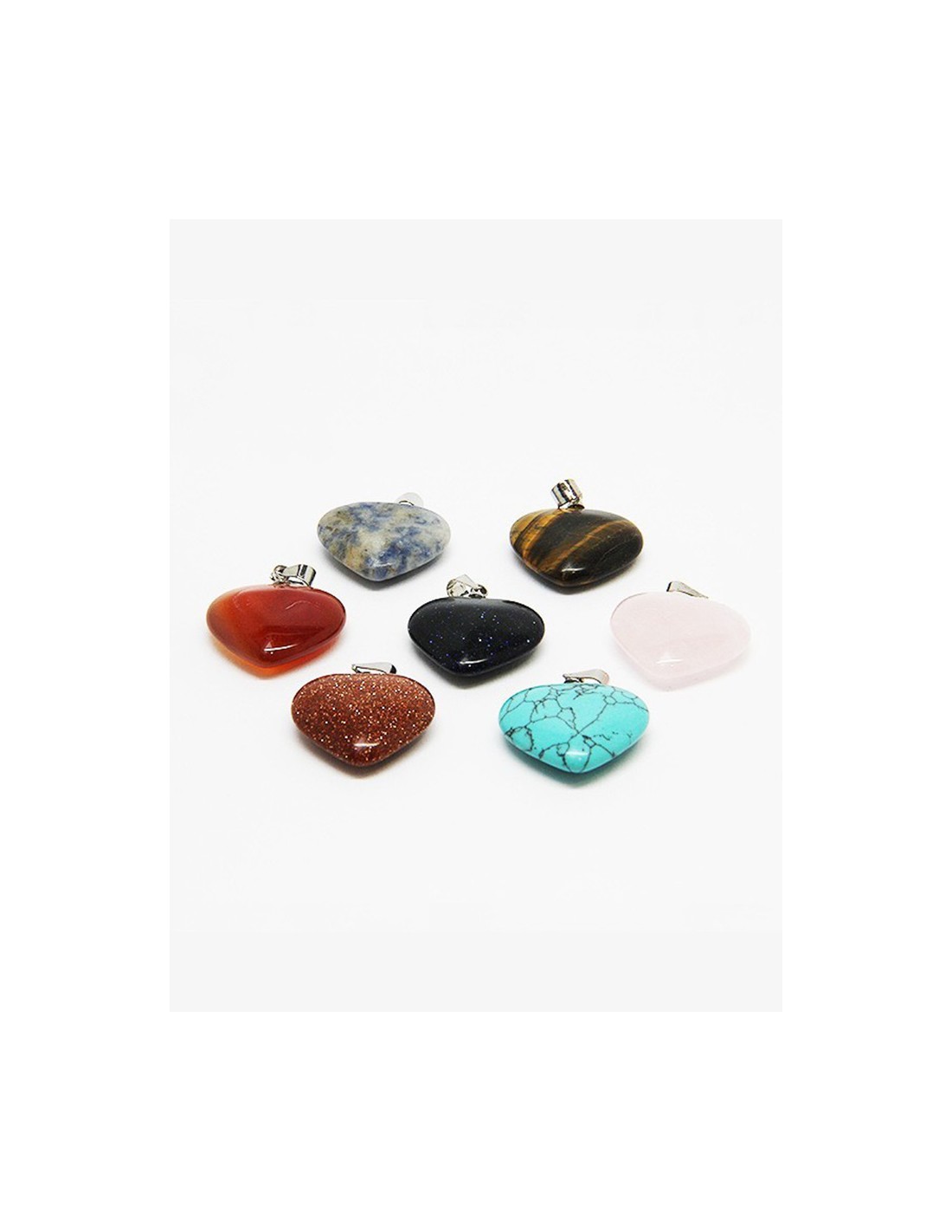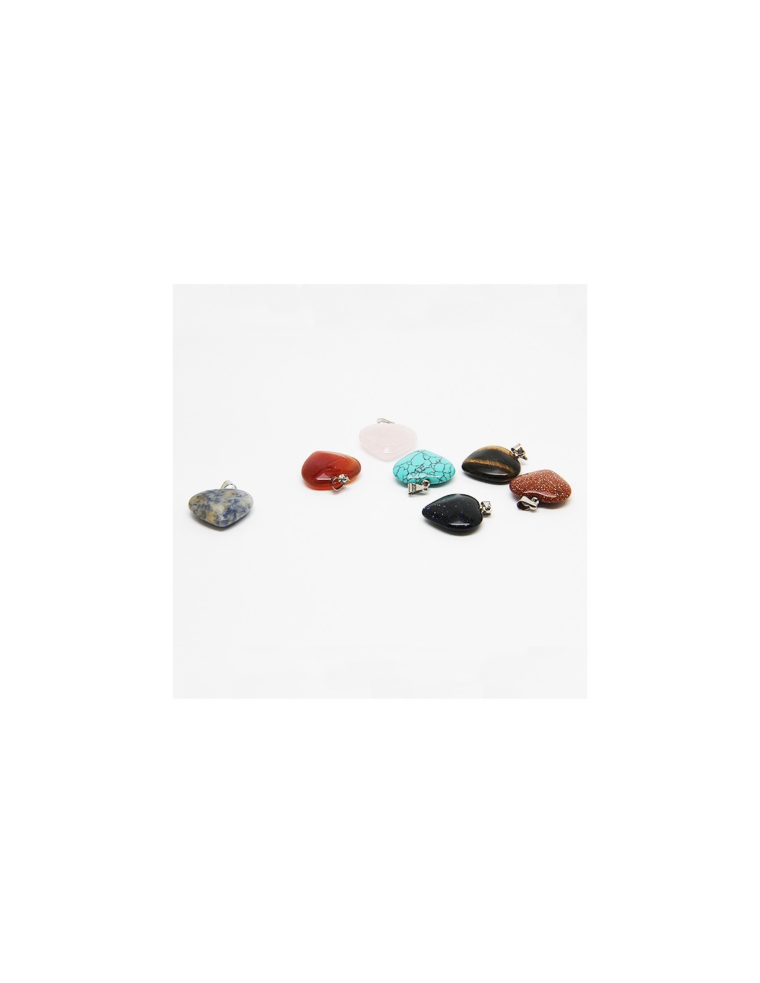 Ce collier est fourni avec 7 pendentifs en forme de cœurs. Les sept pierres sont de la cornaline, de la gold stone, de l’œil de tigre, du quartz rose, de la turquoise reconstituée, de la sodalite et de la purple stone.