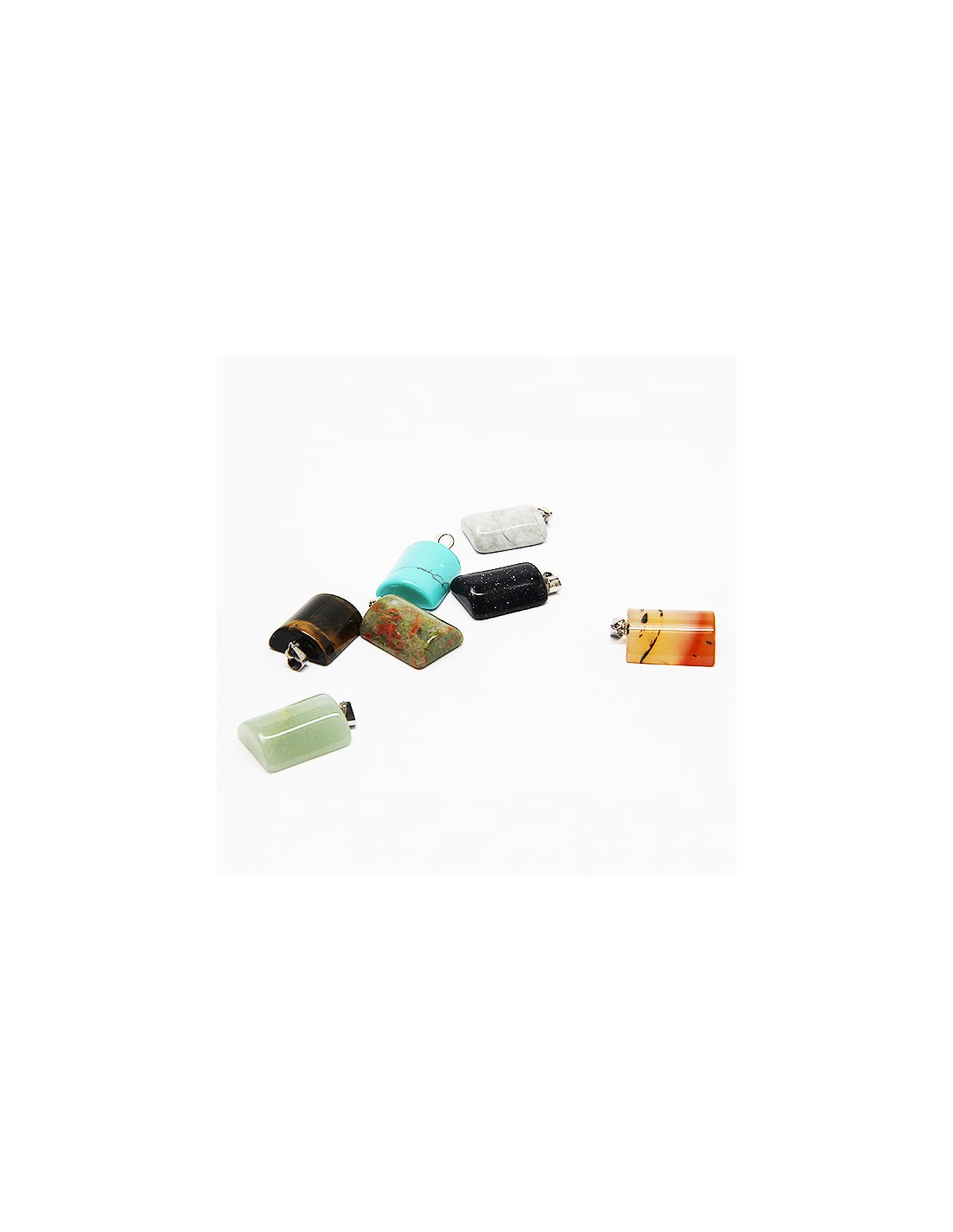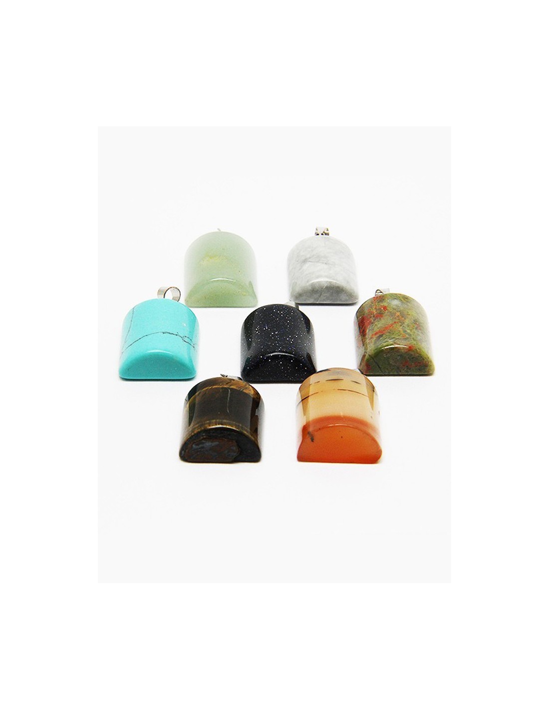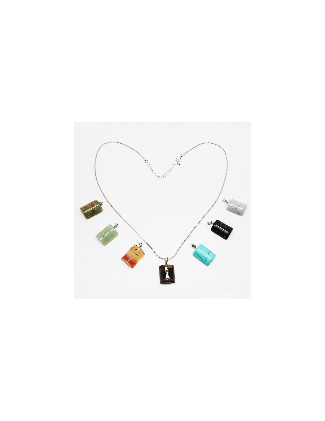 Ce collier est fourni avec 7 pendentifs en forme de demi-cylindre. Les sept pierres sont de la cornaline, de l’œil de tigre, de l'howlite, de l'unakite, de l'aventurine verte, de la turquoise reconstituée et de la purple stone.