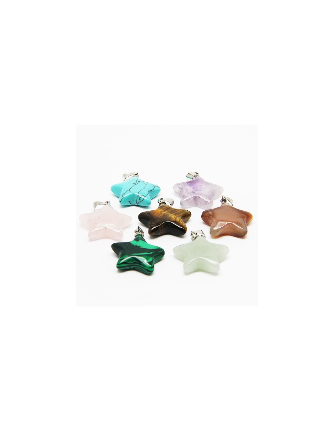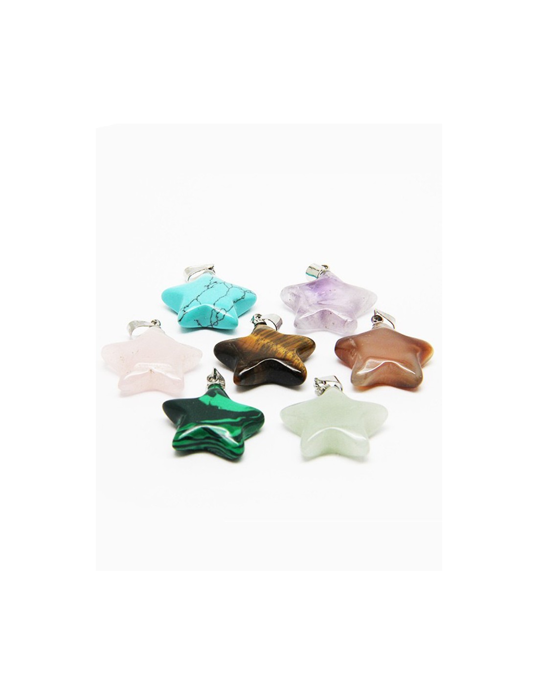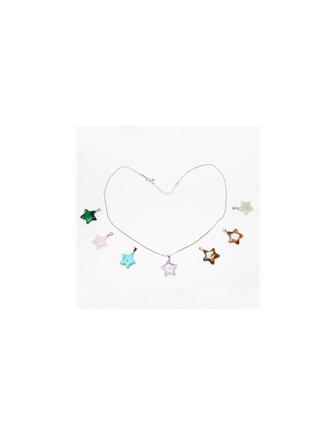 Ce collier est fourni avec 7 pendentifs en forme d'étoiles. Les sept pierres sont de la cornaline, de l’œil de tigre, de la malachite synthétique, du quartz rose, de l'aventurine verte, de la turquoise reconstituée et de l'améthyste.