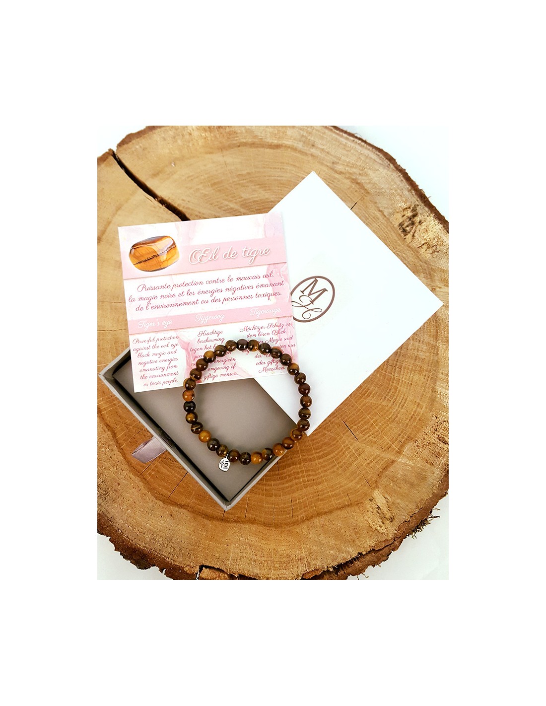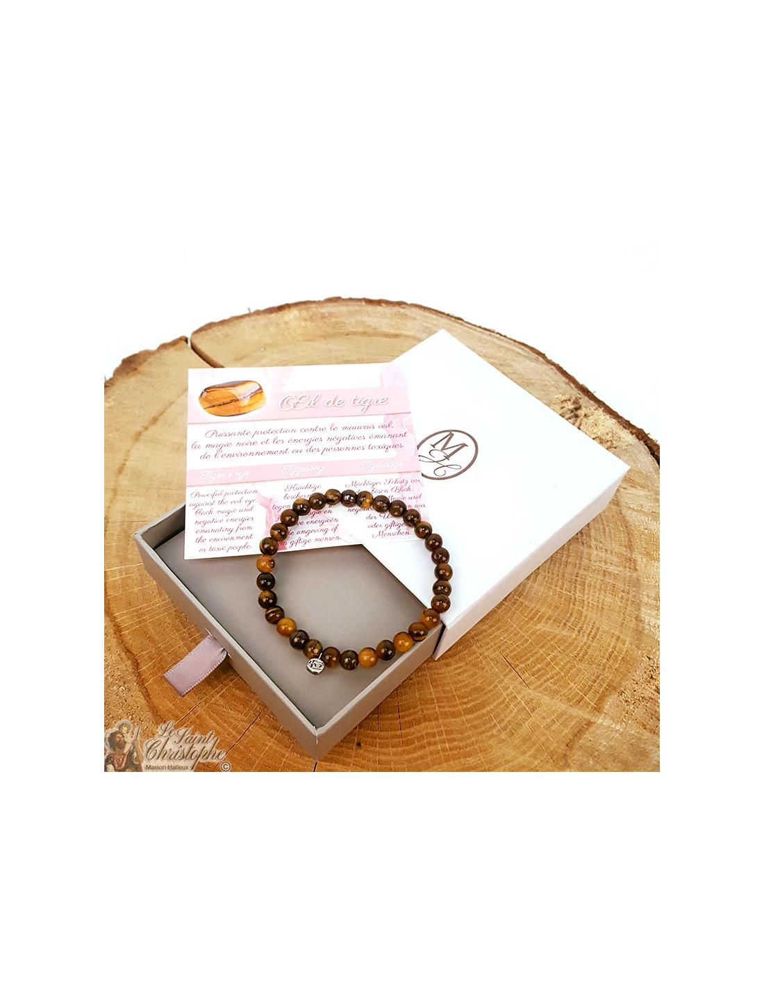 Brun et ocre avec des reflets flamboyants, l'œil de tigre est une puissante pierre protectrice qui prend soin de son porteur en renvoyant le mauvais œil et les énergies négatives des environs ou des personnes toxiques. Il aide aussi à réguler les émotions de la personne qui en porte, d'où cette imperméabilité aux émotions externes qui peuvent submerger les personnes hypersensibles. L'œil de tigre est aussi bénéfique pour stimuler la volonté et la motivation, à prendre confiance en soi et en évinçant la déprime pour apporter joie, bonne humeur, créativité et optimisme. En lithothérapie, il serait aussi possible de l'utiliser pour amoindrir les douleurs articulaires, renforcer le métabolisme, diminuer les crises d'asthme, à fluidifier et réguler la digestion.