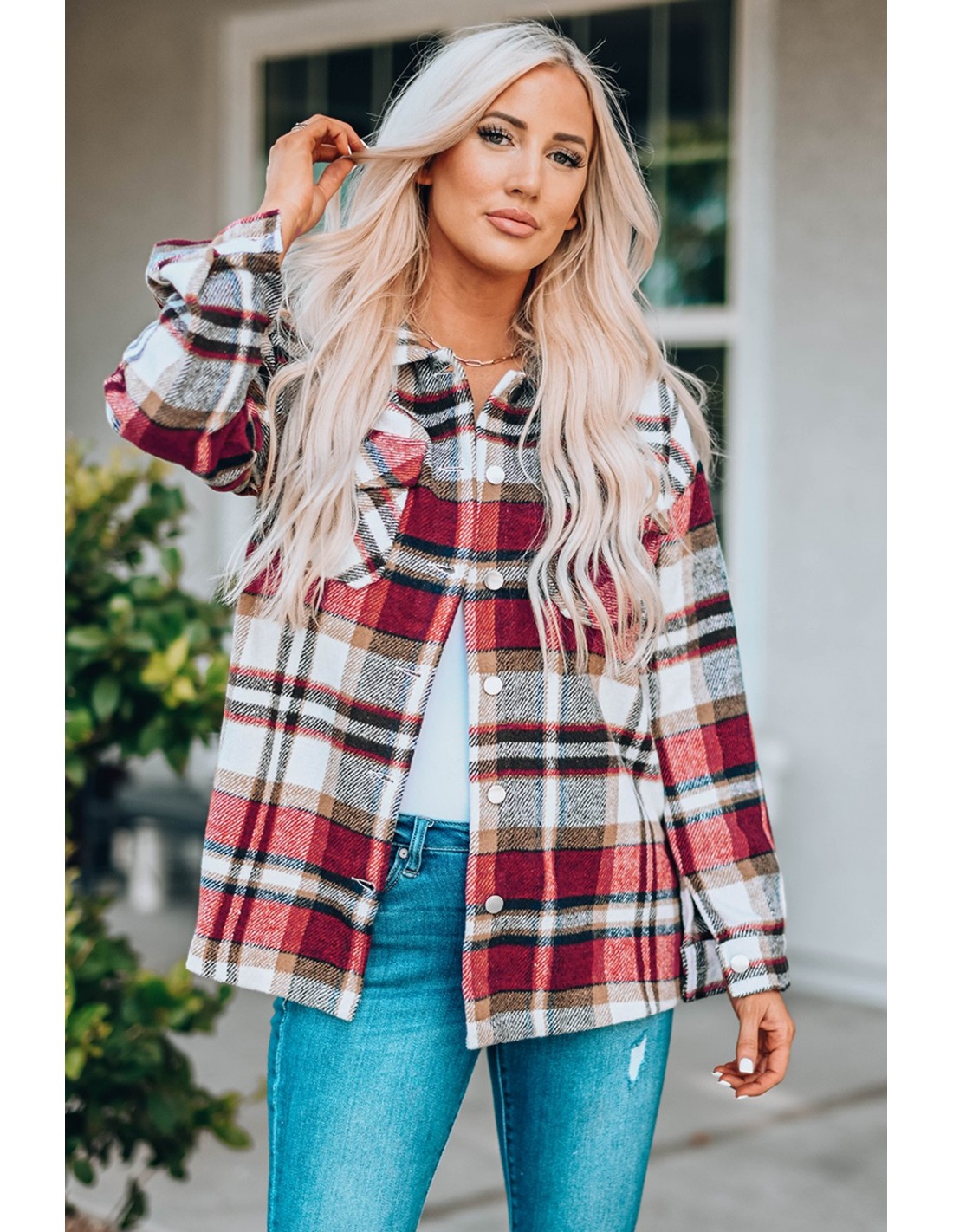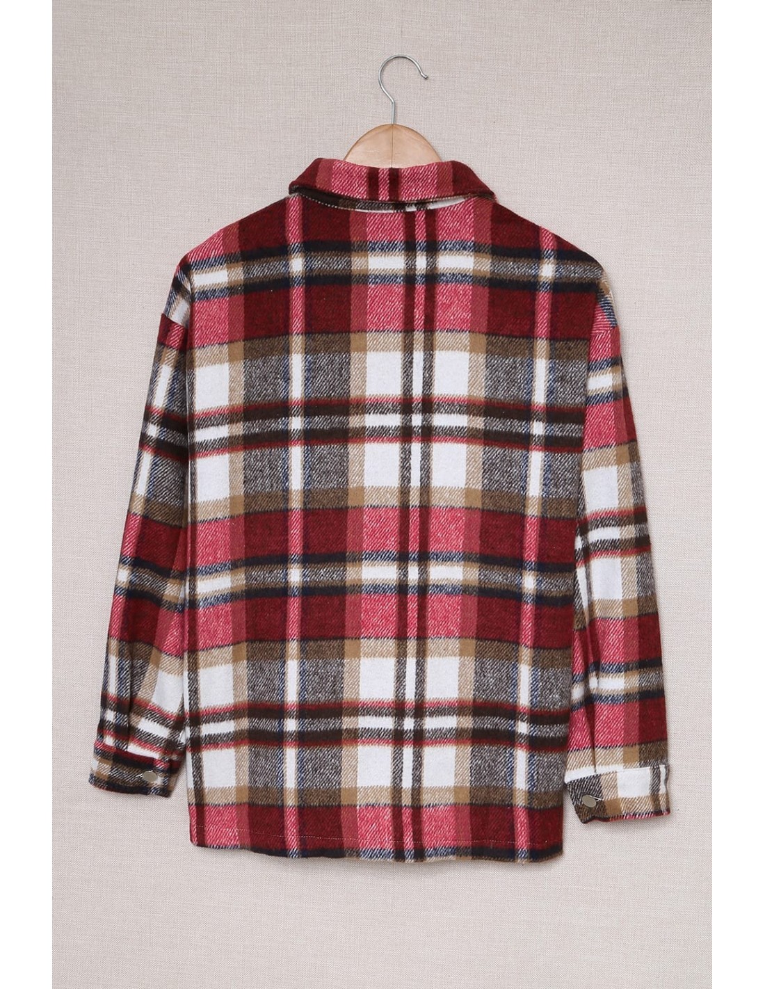 Chemise pour femme avec motif à carreaux style tartan aux couleurs rouges. Avec une coupe ample et décontractée, cette chemise à manches longues est ornée de boutons en métal et de deux poches à l'avant sur le haut du torse. Les poches sont utilisables. Le tissu est très doux, en matière polyester rappelant les plaids douillets. La chemise tient bien chaud.