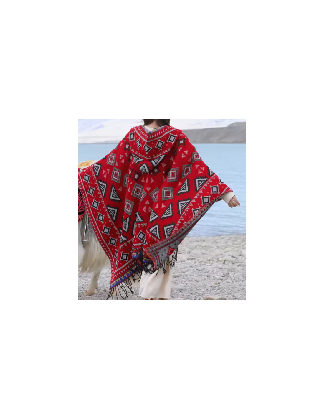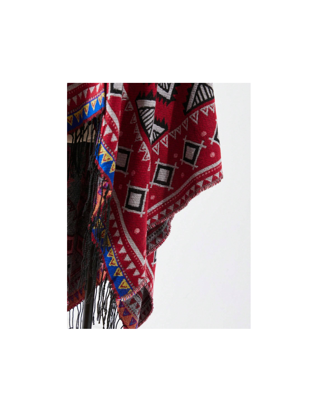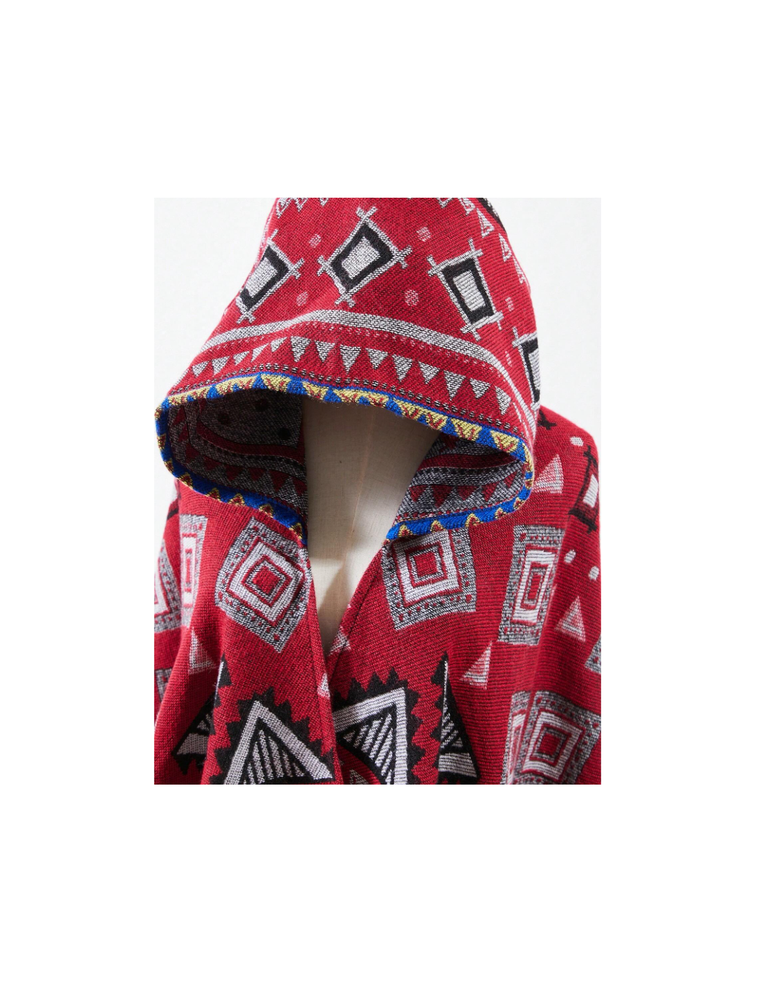 Découvrez notre poncho boho pour femme, un véritable symbole de l'esthétique bohème. Arborez fièrement ses motifs géométriques en blanc, noir, bleu et jaune sur fond rouge vermeil, créant un contraste visuellement captivant. Conçu en polyester, ce poncho à capuche est aussi confortable que tendance. Sa taille unique convient parfaitement aux tailles 38 à 52, offrant ainsi une polyvalence appréciable. Parfait pour une tenue décontractée avec une touche artistique, ce poncho est un incontournable pour celles qui recherchent l'originalité et le confort.