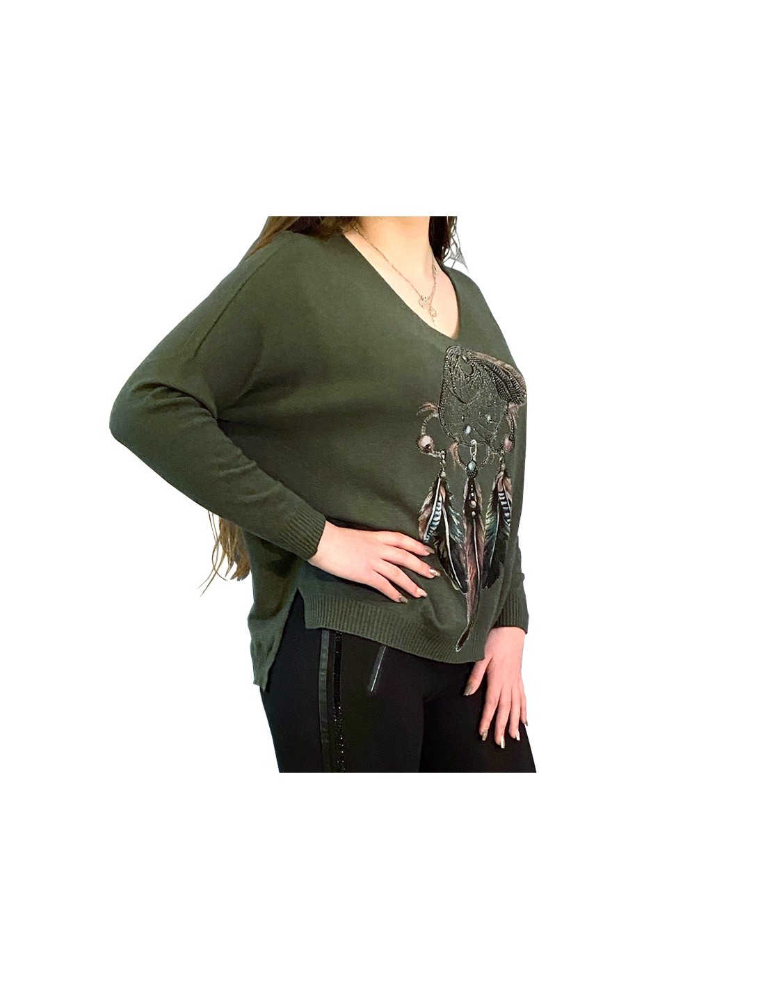 Ce pull est imprimé d'un bel attrape-rêve parsemé de strass. L'ensemble est aux couleurs de la nature avec quelques touches plus fantaisistes apportées par le motif.