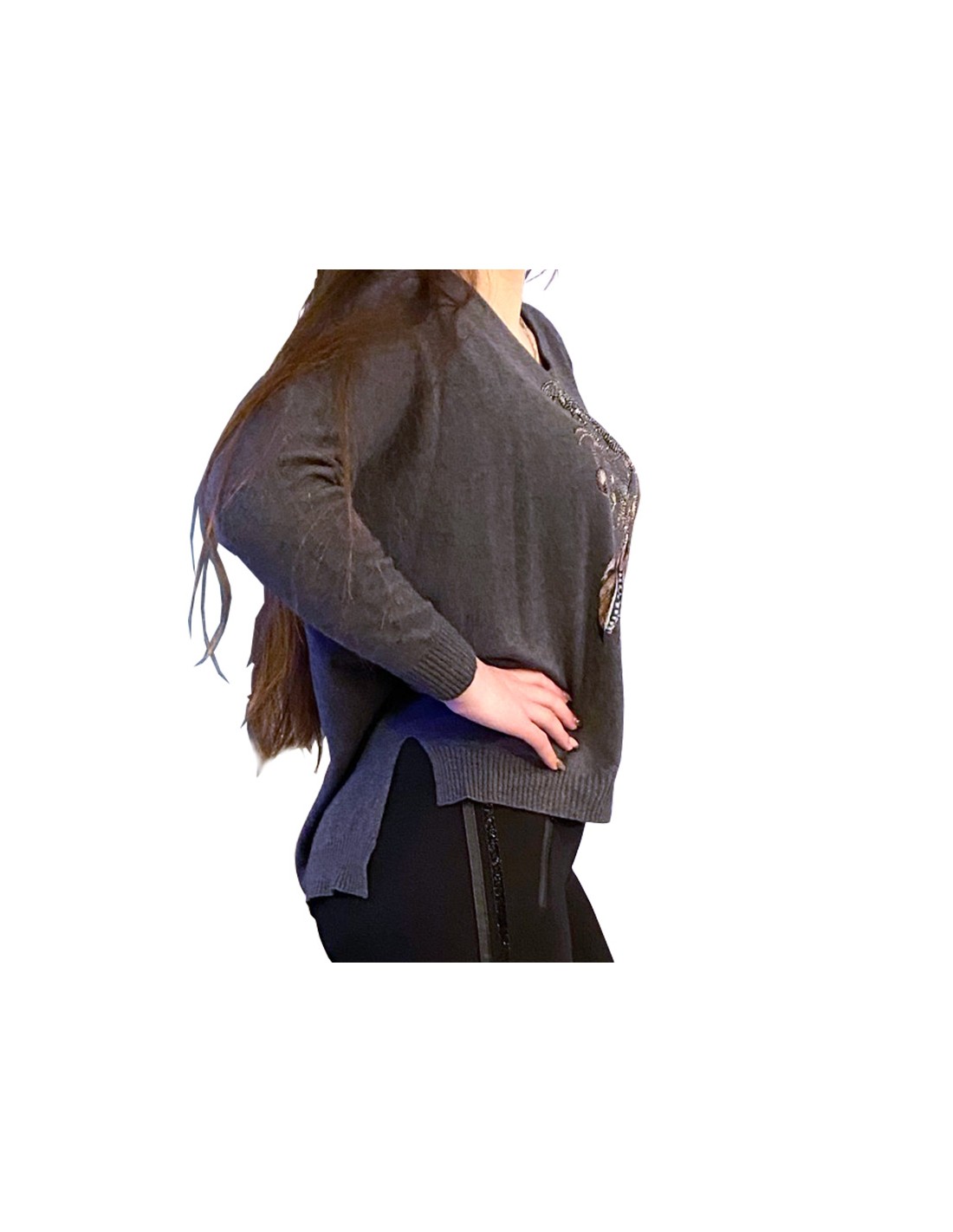 La coupe du pull est ample au niveau du torse et laisse respirer le corps, le décolleté en U laisse respirer le cou. Une combinaison parfaite pour la mi-saison, tenant chaud sans étouffer pour autant. Le bas du pull et les manches sont moulantes, apportant du confort et un côté pratique.