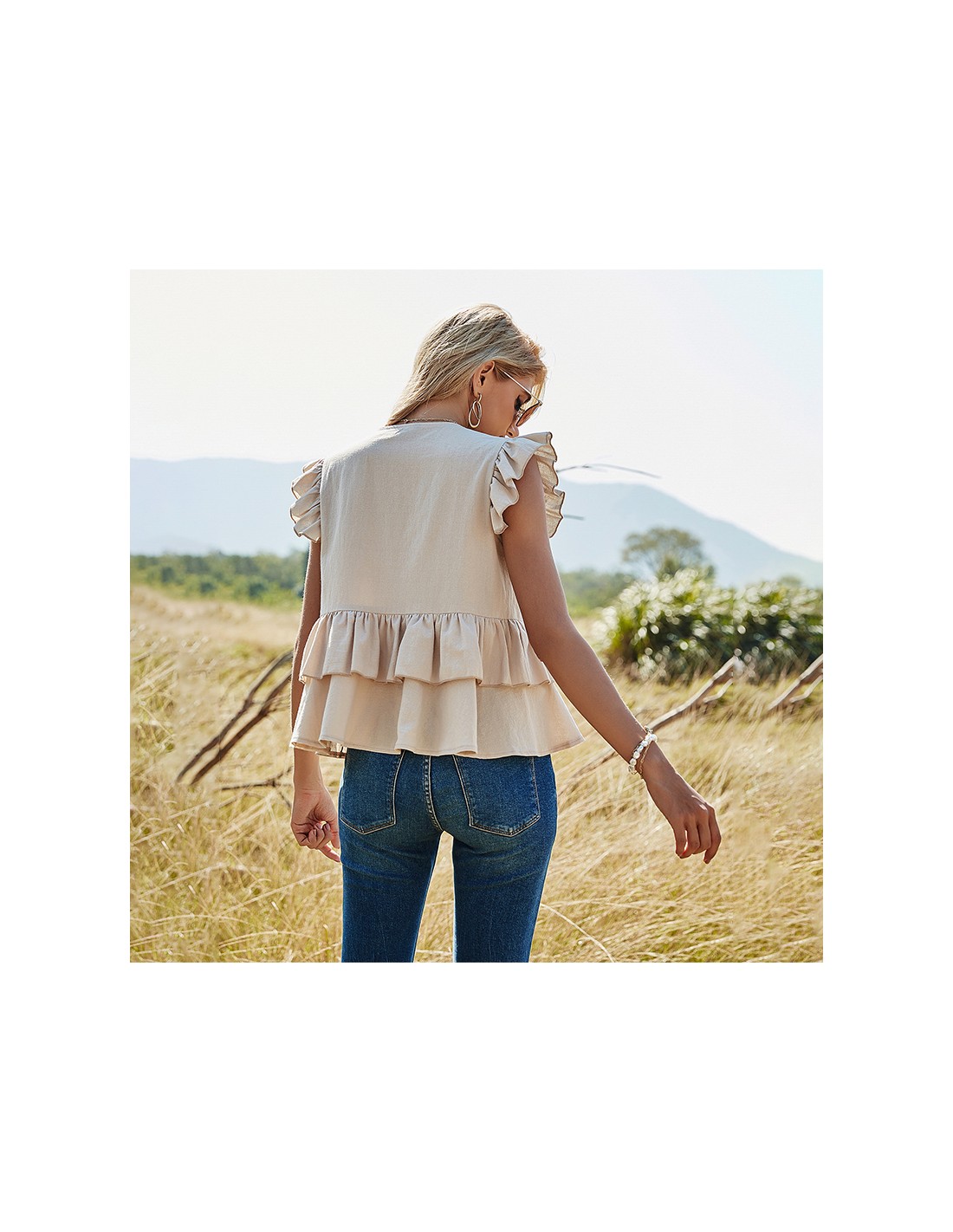 Chemisier à manches courtes aux volants délicatement plissés au niveau des épaules et de la taille. Couleur beige naturelle pour un style boho.