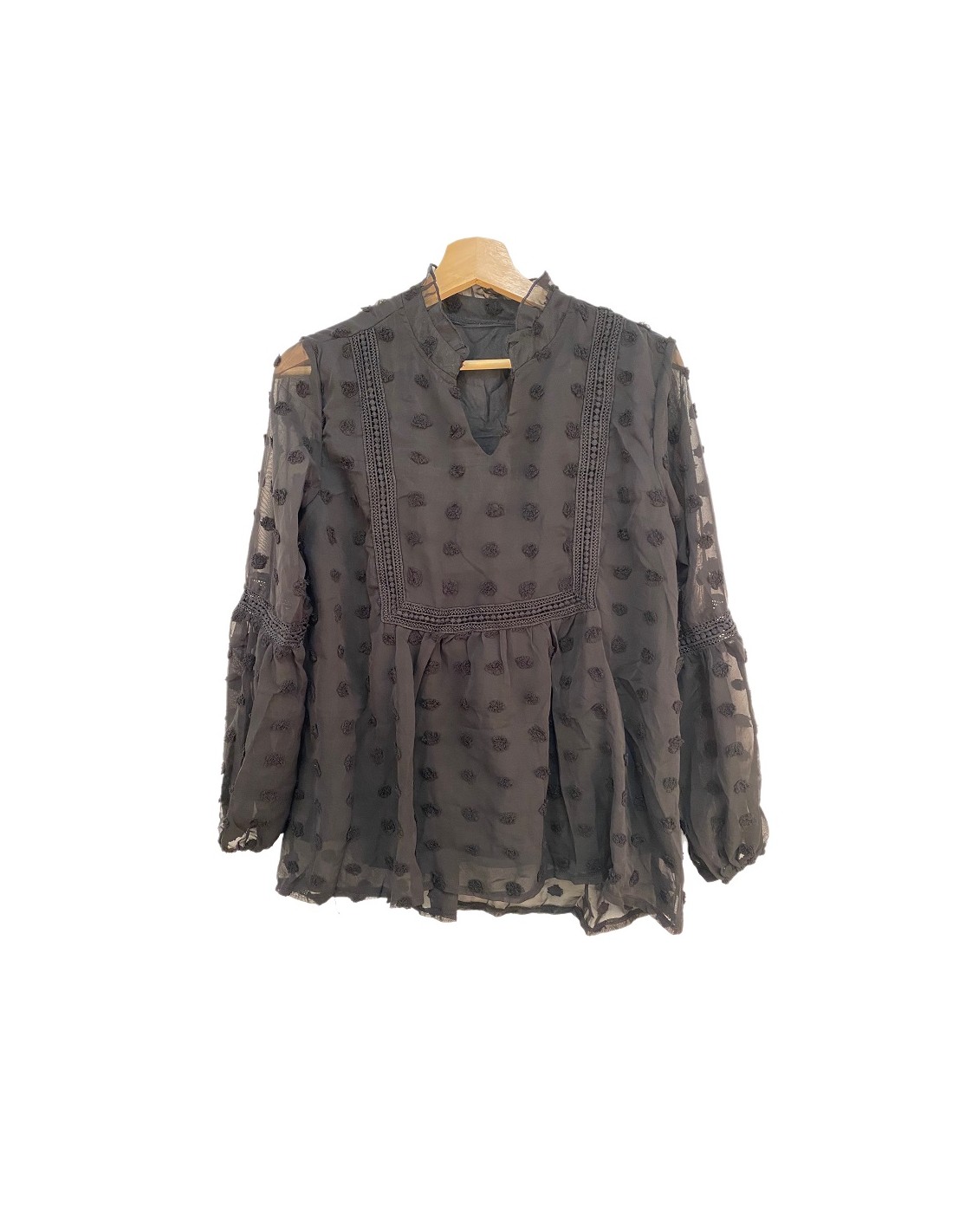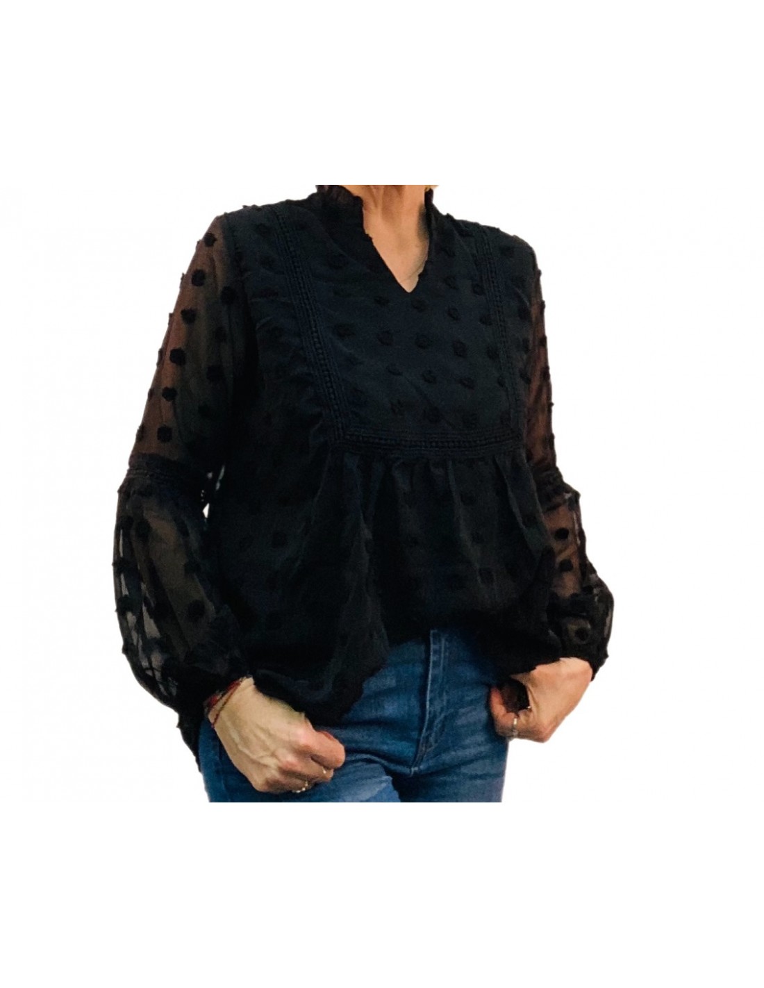 Chemisier blouse en mousseline avec liserés brodés sur l'avant et les manches et pois sur toute la surface du tissu. Col en V et intérieur doublé. C'est un vêtement léger et souple pour un effet bohème chic assuré !