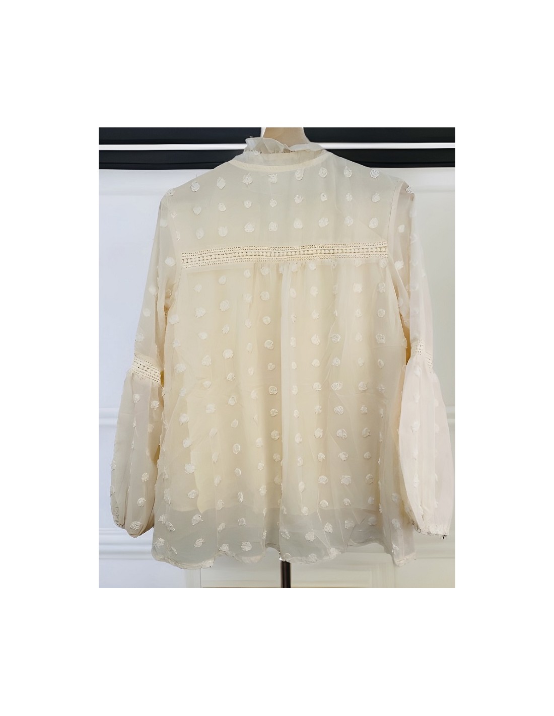Cette blouse-chemisier est en mousseline. Les manches bouffantes et la coupe ample en font un vêtement de printemps et d'été parfait car il est léger à porter. Le col en V laisse respirer le décolleté sans en réveler trop. Le vêtement est décoré de plusieurs liserés, sur les manches, l'avant et le dos. La doublure intérieure est plus opaque pour être plus confortable. La surface du tissu est couverte de pois brodés.