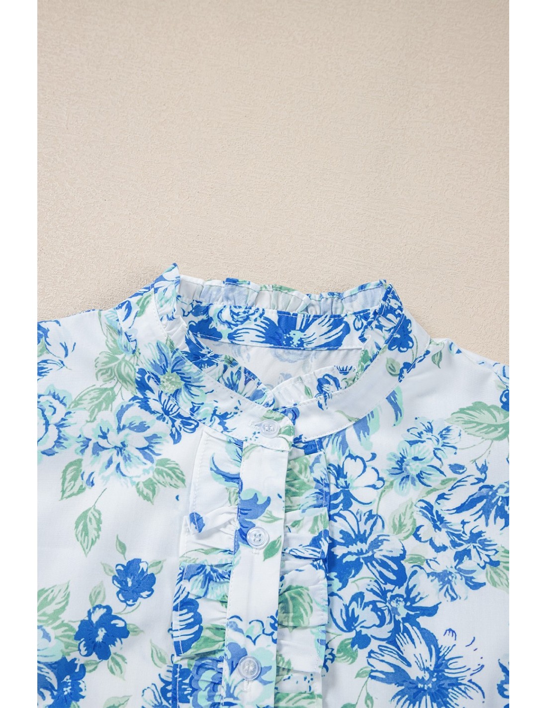 InstructCatégorie : Blouses & Chemisiers Couleur : Bleu Ciel Matière : 100% Polyester Tailles disponibles : M, L, XL 💫 Description du produit : Cette chemise à imprimé floral apporte une touche d'élégance et de charme à votre tenue. Les manches volantées ajoutent une dimension élégante à votre look. Fermeture à boutons sur le devant pour une facilité d'habillage et une grande polyvalence. Détail de col froncé, parfait pour ajouter une touche sophistiquée et féminine. ✨ Un choix idéal pour un style raffiné et élégant, parfait pour toute occasion !ions d'entretien :