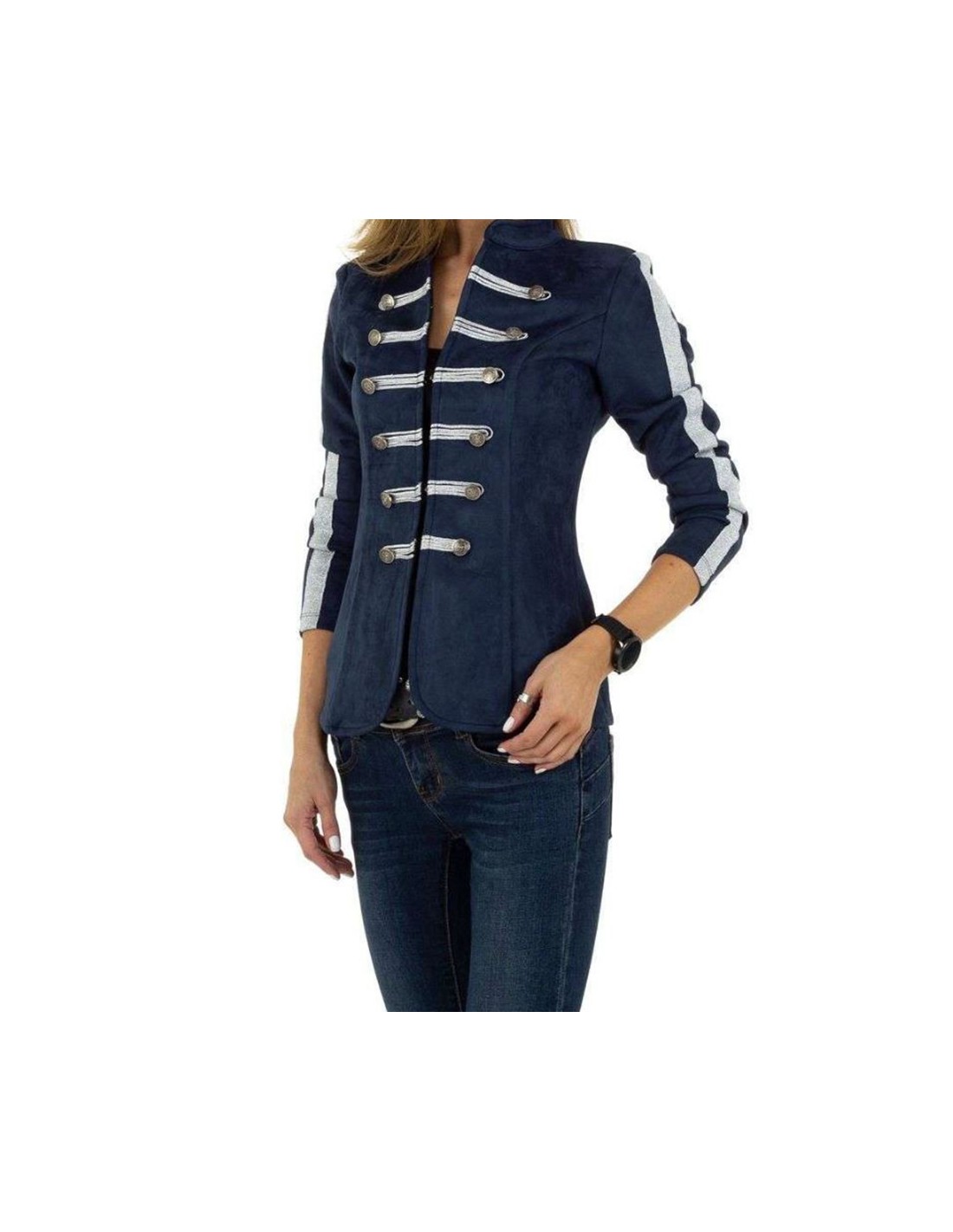 Ce blazer bleu outremer a le chic pour attirer les regards grâce à sa coupe légèrement cintrée qui met en valeur les courbes mais aussi par ses broderies linéaires sur le torse et les bras. Celles-ci donnent un côté sportif et militaire à la fois, rappelant les vestons d'uniformes masculins napoléoniens. Le col rigide et montant donne un effet digne qui ajoute à sa superbe. Les attaches sont cachées à l'intérieur des pans de la veste afin d'en préserver le style tout en vous donnant l'occasion de la porter selon votre envie.