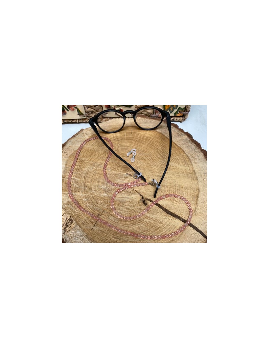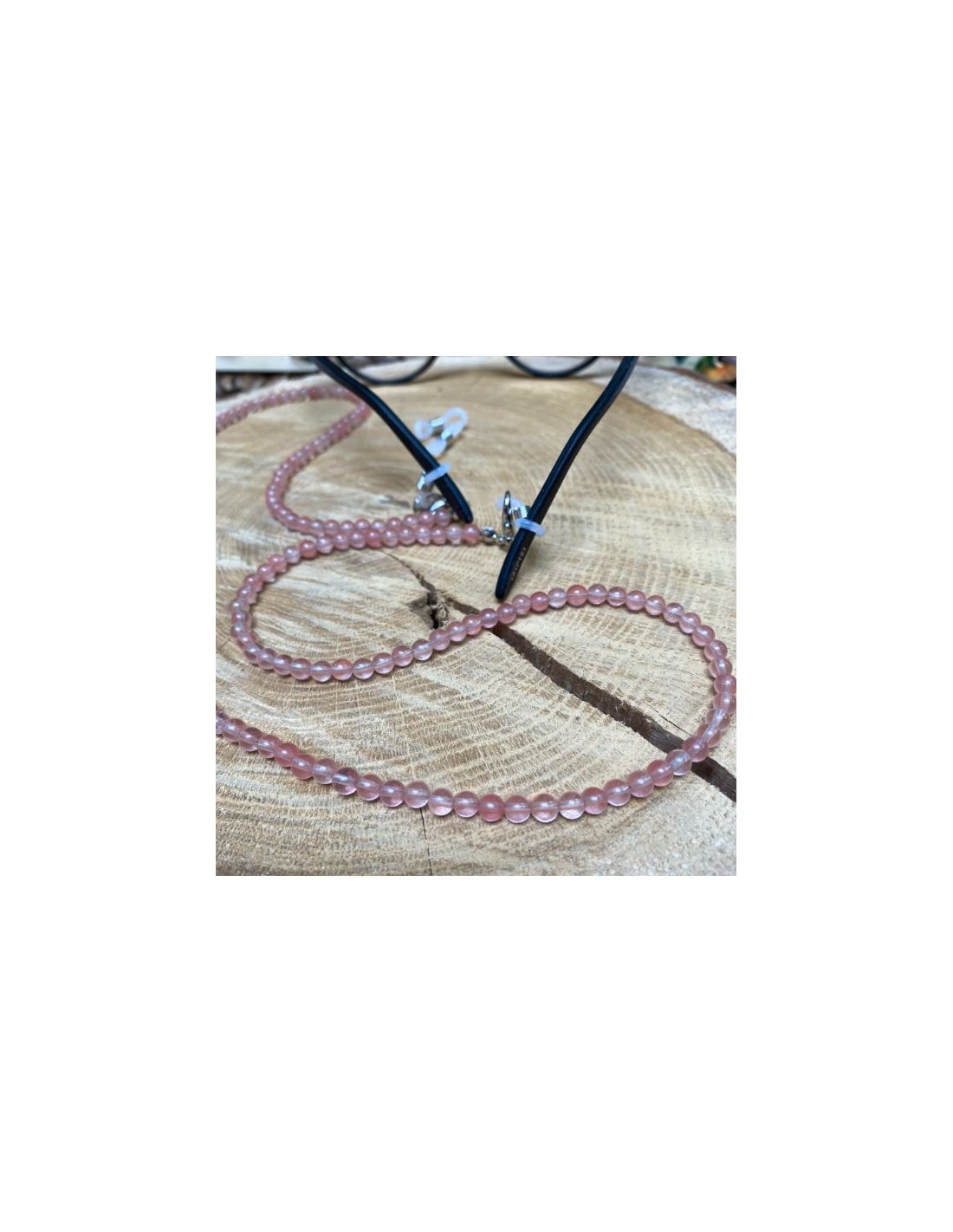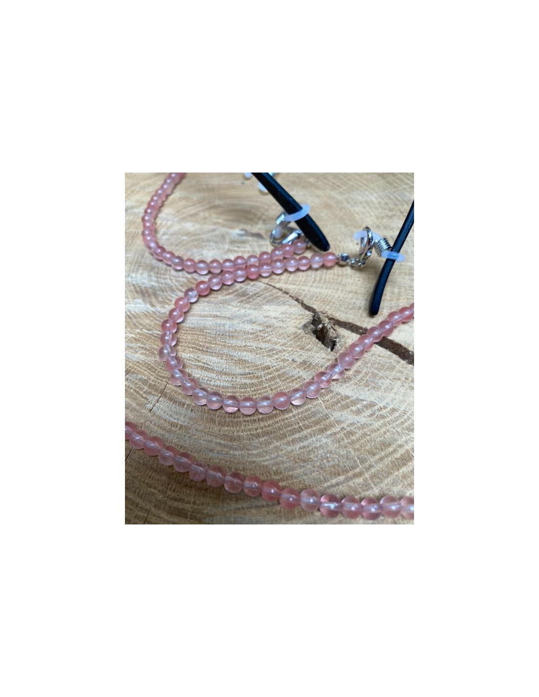 Ce cordon pour lunettes est un accessoire chic et pratique. Pratique pour garder ses lunettes sur soi sans avoir à les porter, chic grâce aux perles de quartz rose, une pierre fine réputée en lithothérapie pour ses vertus.