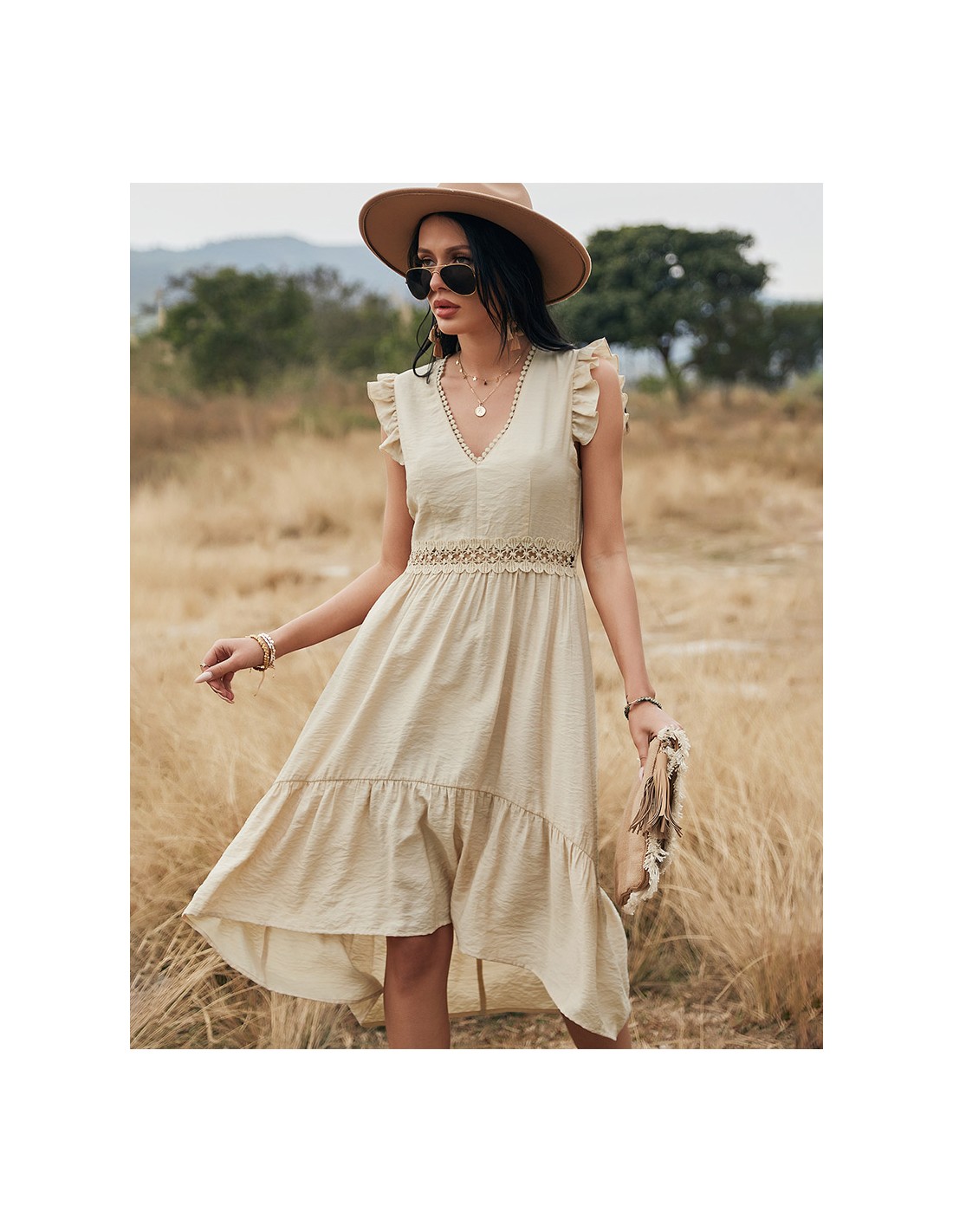 Robe en polyester, d'un beige nature, avec un décolleté profond en V orné de crochet, la taille ornée de dentelle, et les épaules de volants légers.