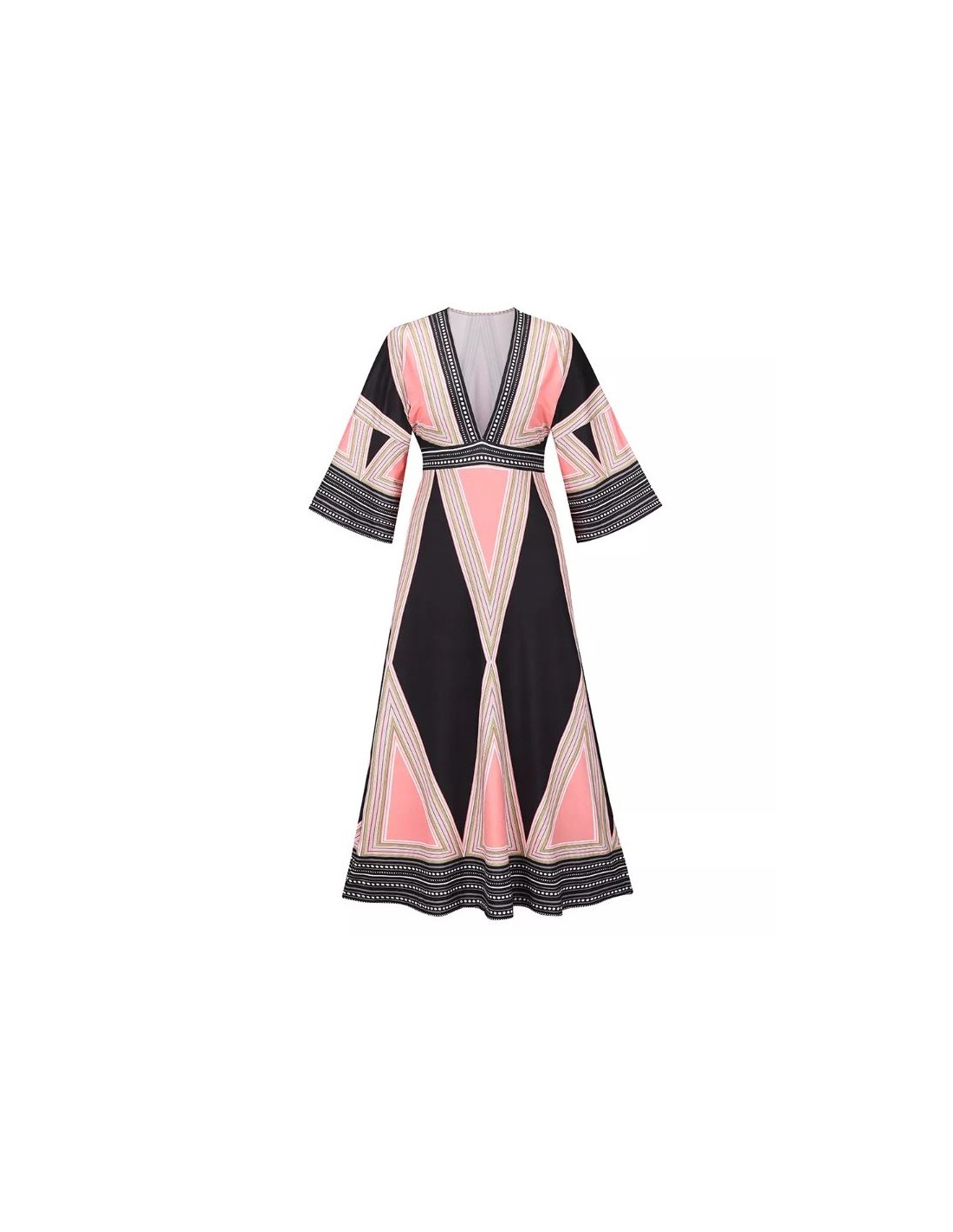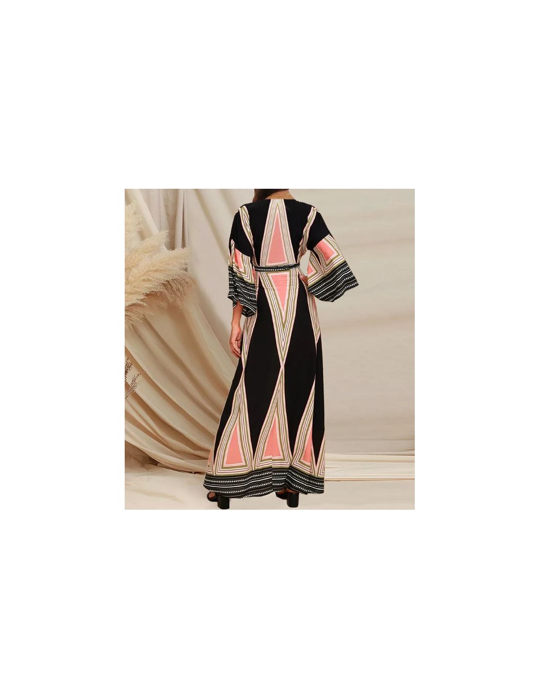 Robe longue noire et rose au style bohème et aéré. Ses manches 3/4 sont amples pour un effet léger. Ses motifs géométriques noirs et roses donnent un côté ethnique qui mettent les formes en valeur.