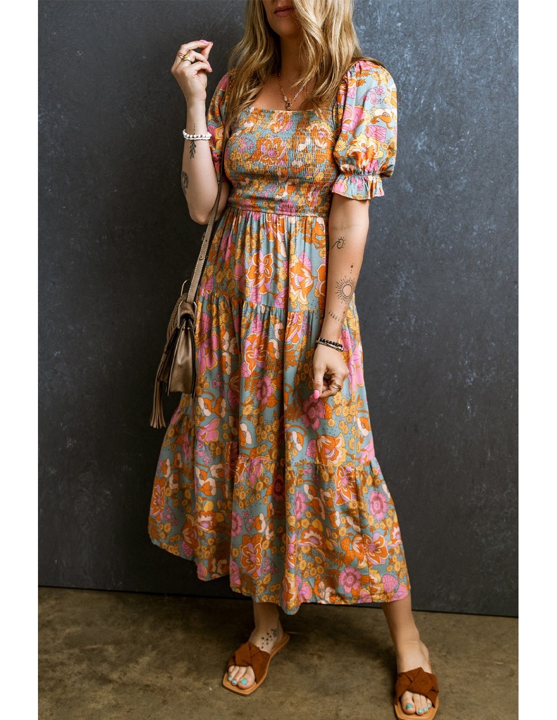 🌸 Robe Multicolore Fleurie à Buste Smocké, Taille Haute et Manches Bouffantes 🌸