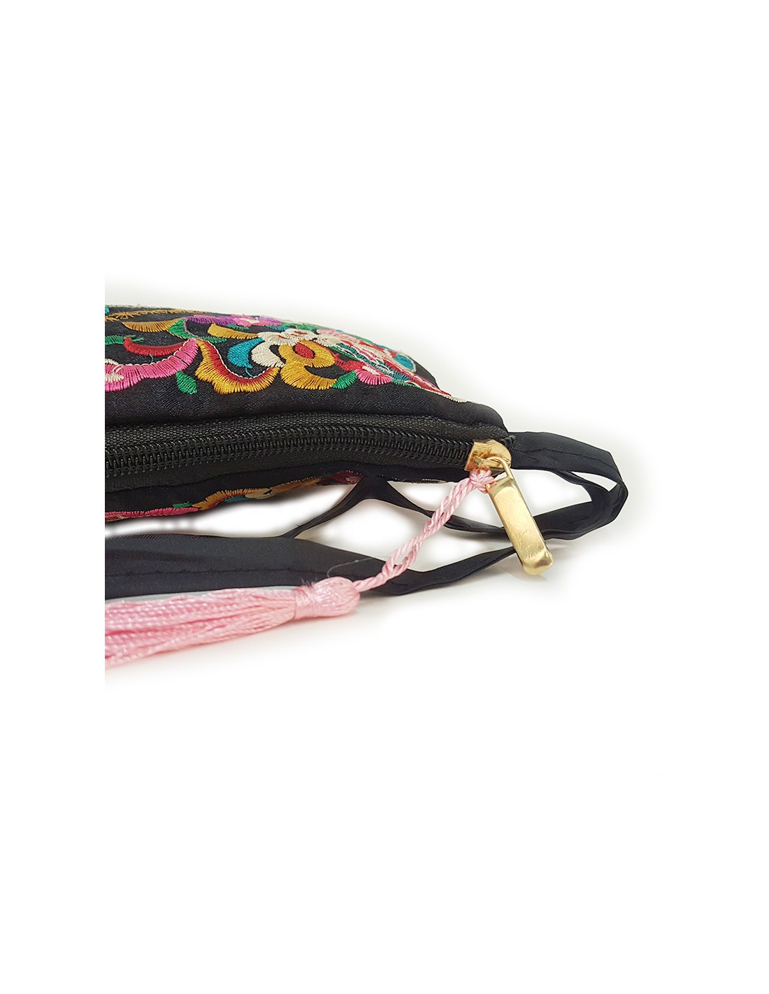 Pochette brodée d'un motif de visage de la chance et de décorations florales et colorées sur fond noir et ornée d'un pompon rose. La fermeture éclaire est longue et dorée.