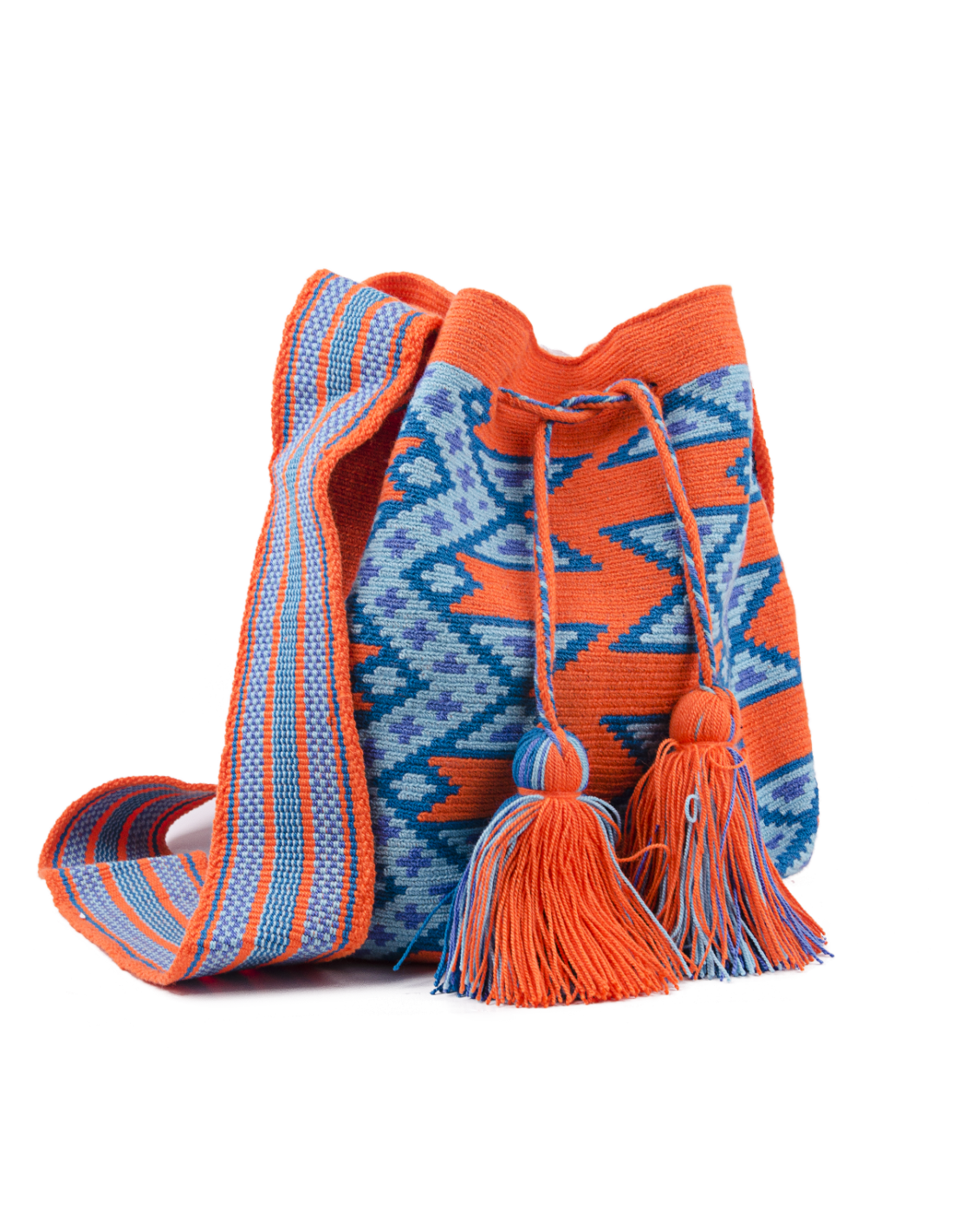 Sac Mochila Wayuu, tissé avec une maille fine et des motifs ethniques très colorés orange et bleu. La bandoulière est large et confortable.