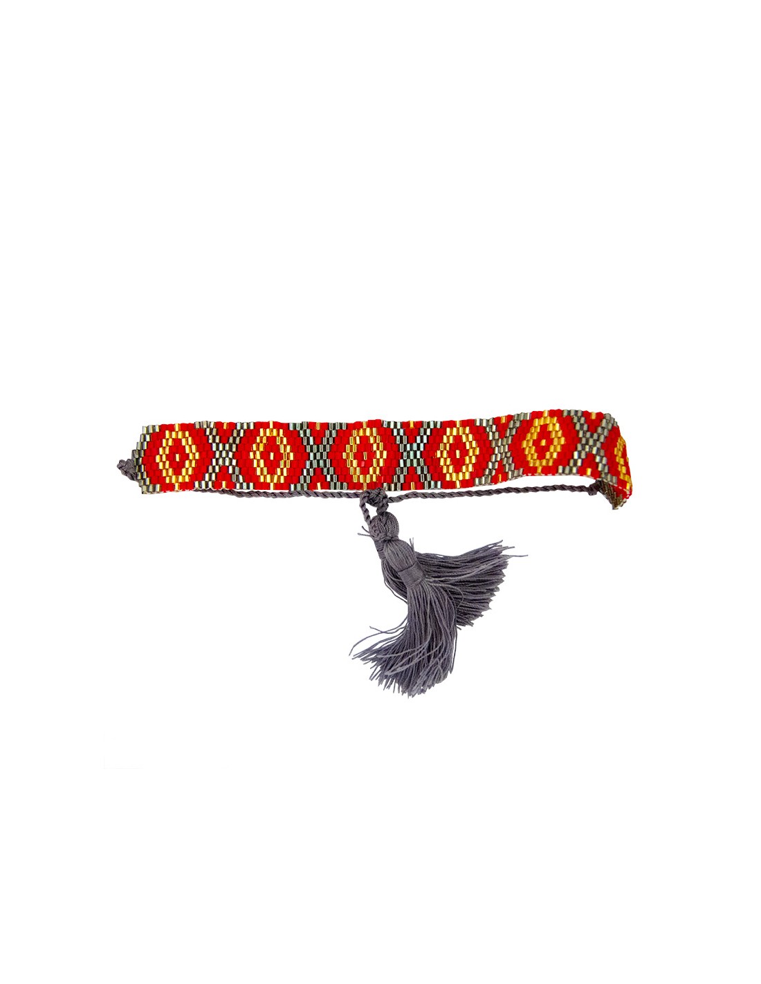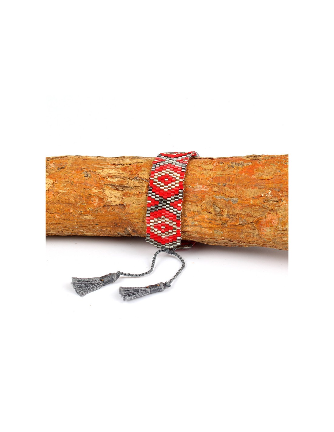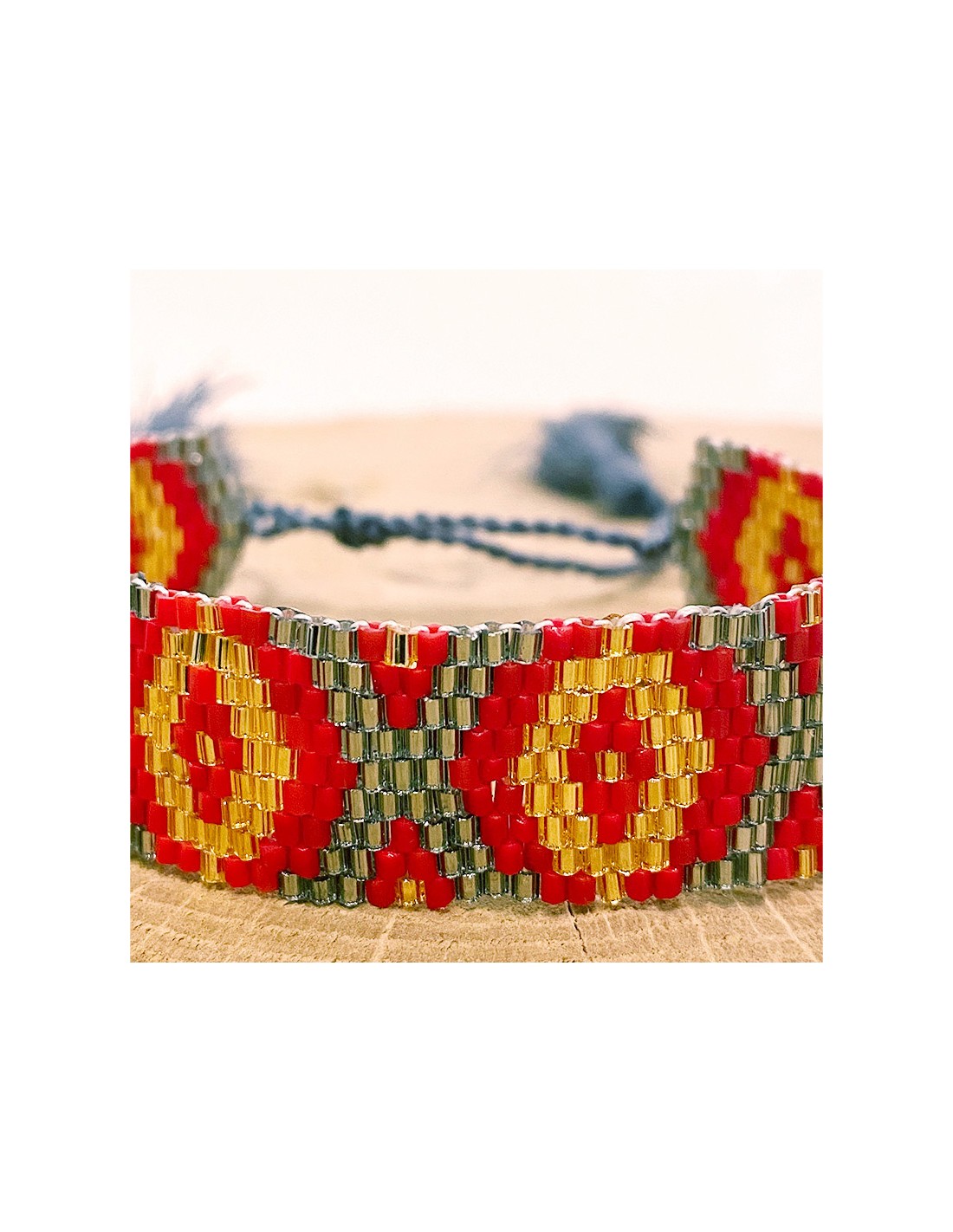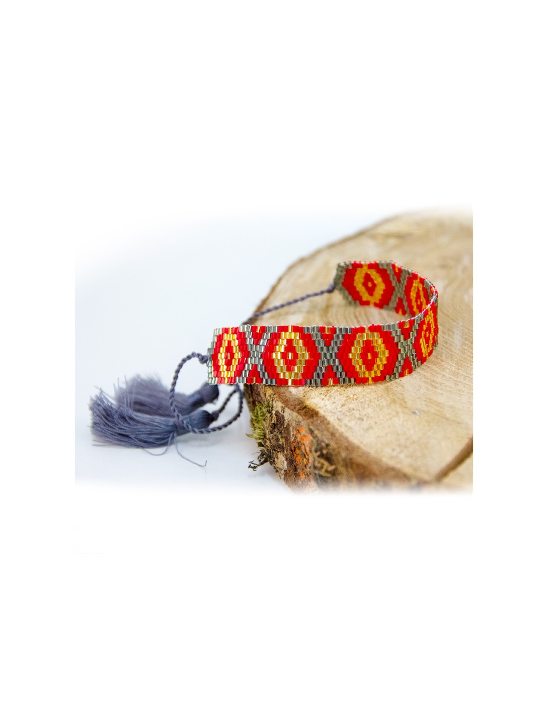 Brede armband van kralen gevlochten tot geometrische patronen, met kwastjes in de kleuren van de kralen. Een delicaat en elegant accessoire dat perfect is om uw outfit een chic tintje te geven!