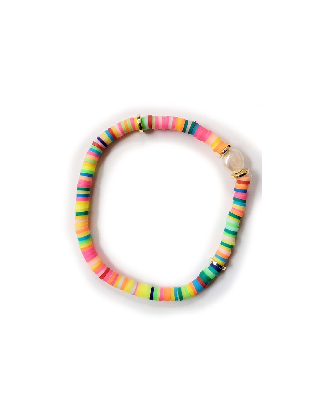 Boheemse elastische armband met de hand gemaakt met segmenten van polymeerklei in neon tinten, versterkt met gouden parels en een zoetwaterparelmoer.