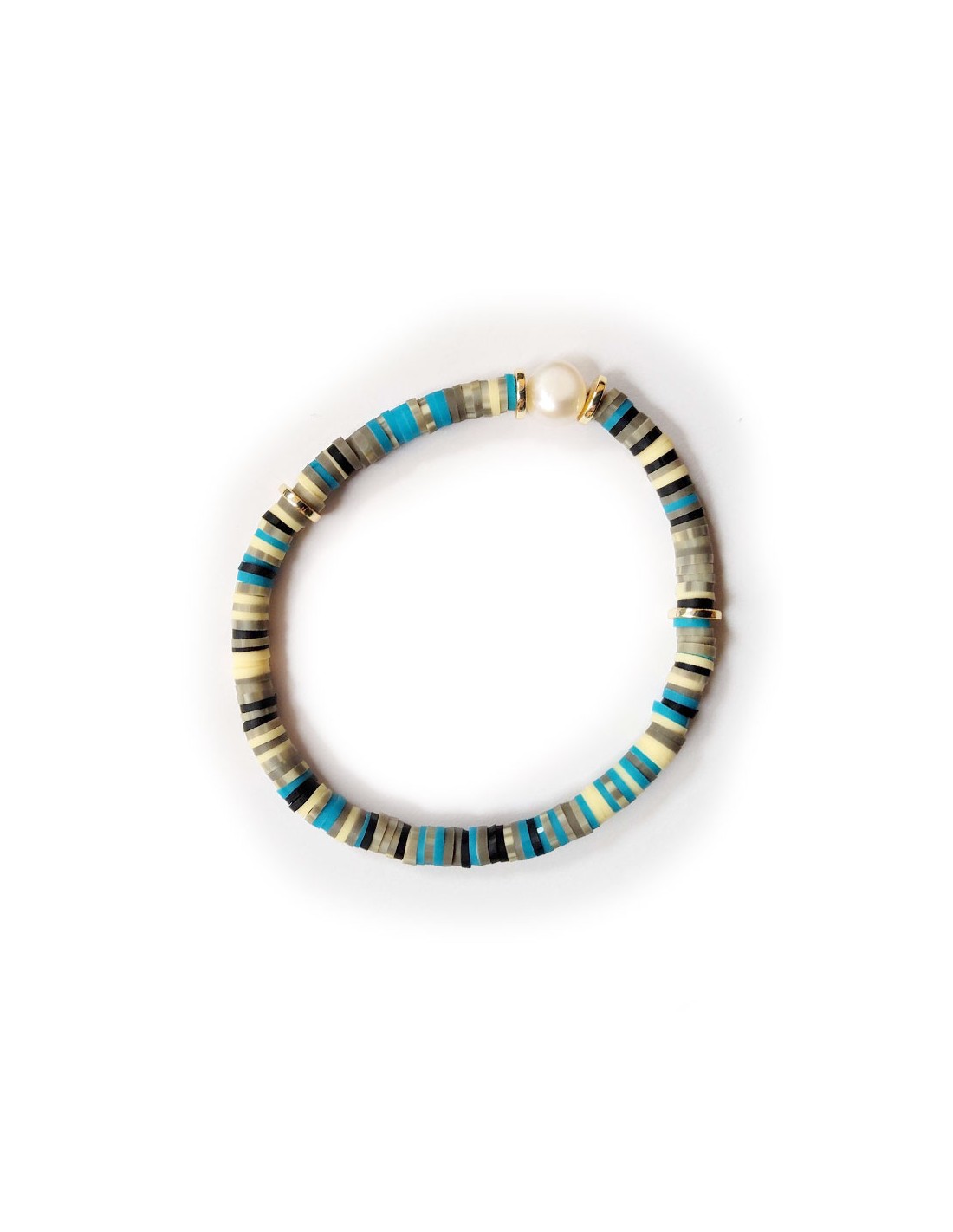 Mooie Boheemse armband in blauwe en bruine tinten, die doet denken aan een strand met goudkleurig zand. Handgemaakt door ambachtslieden, gemaakt van kleine stukjes polymeerklei en verfraaid met vier gouden parels en een zoetwaterparel waarvan de parelwitte kleur perfect past bij de veelkleurige mix van de armband.