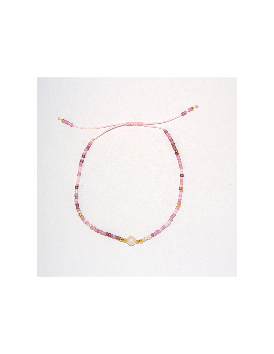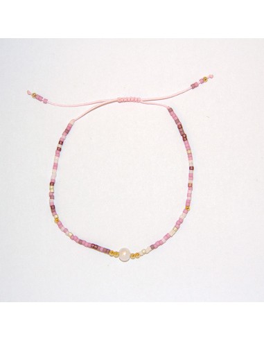 Deze delicate en fijne armband is in het midden versierd met een echte parel van paarlemoer, die zelf omringd is door gouden parels die haar accentueren. Andere gouden parels stippelen elegant de draad van de armband en de uiteinden ervan uit als lichtgevende accenten om het geheel op te fleuren. De macramé-knoop weerspiegelt de parelmoeren kraal, en de vliegende draden met vier parels zorgen voor een lichte en subtiele toets.