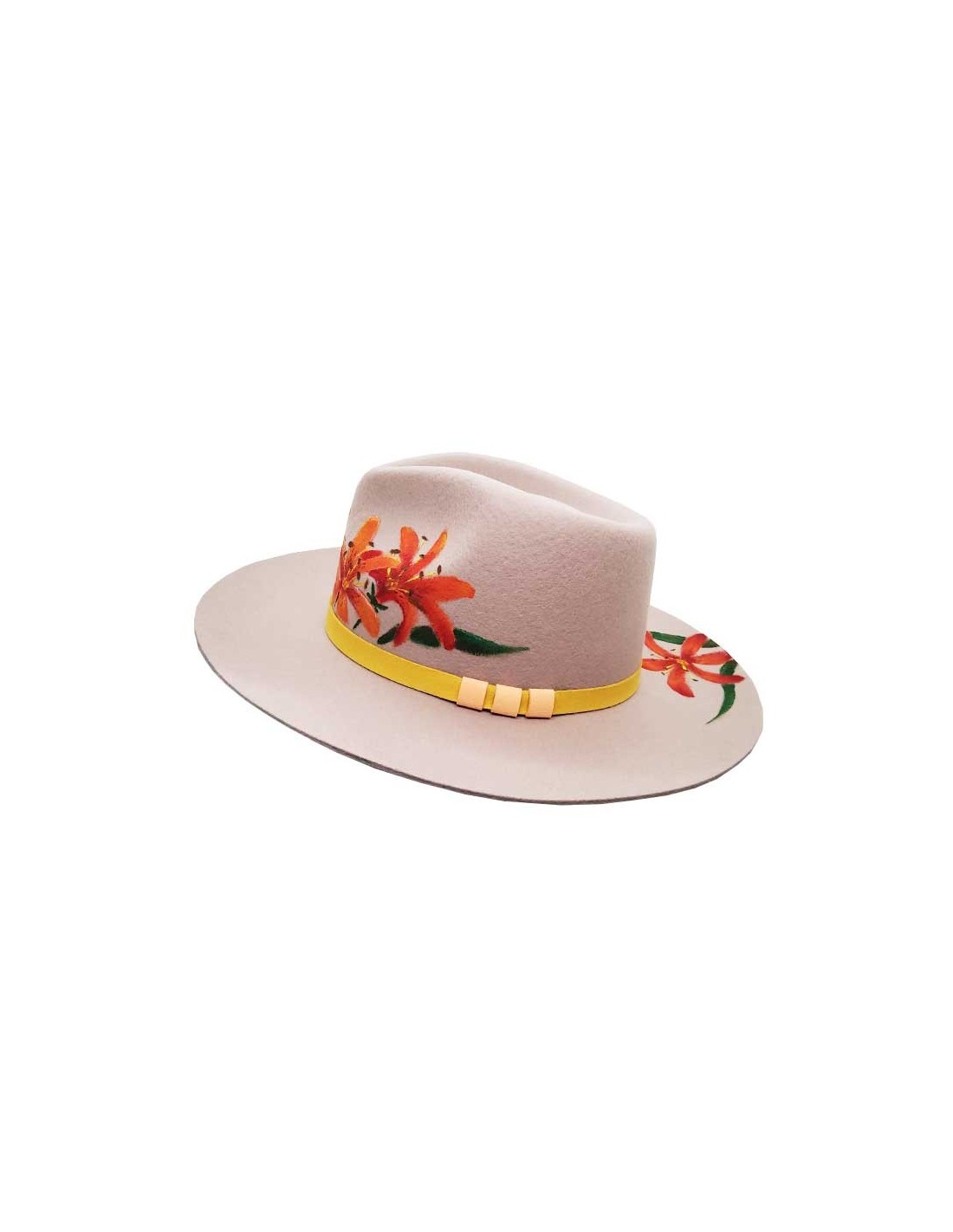 De fedora hoed is een tijdloze bohemian chic klassieker! Dit model van voorjaarsvilt is op maat gemaakt met een serie tijgerlelies op een grijze achtergrond en een geel suède tong versierd met drie lichtgele vierkantjes.