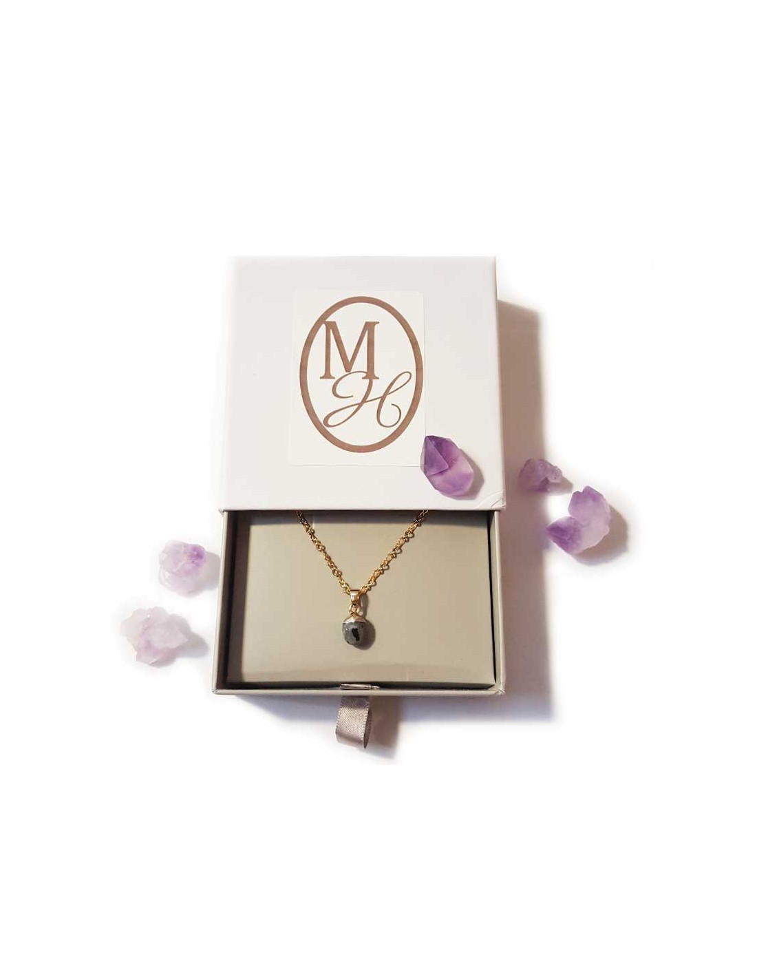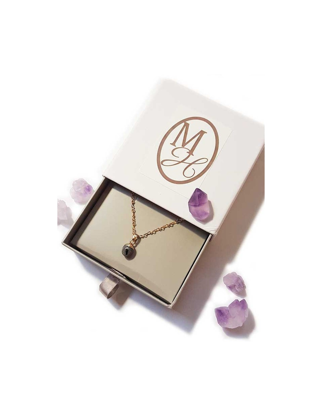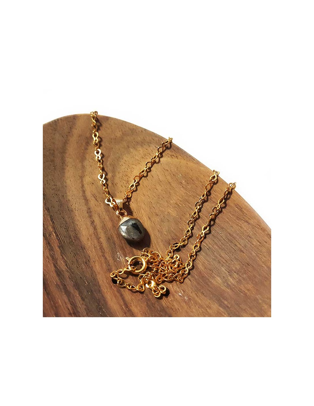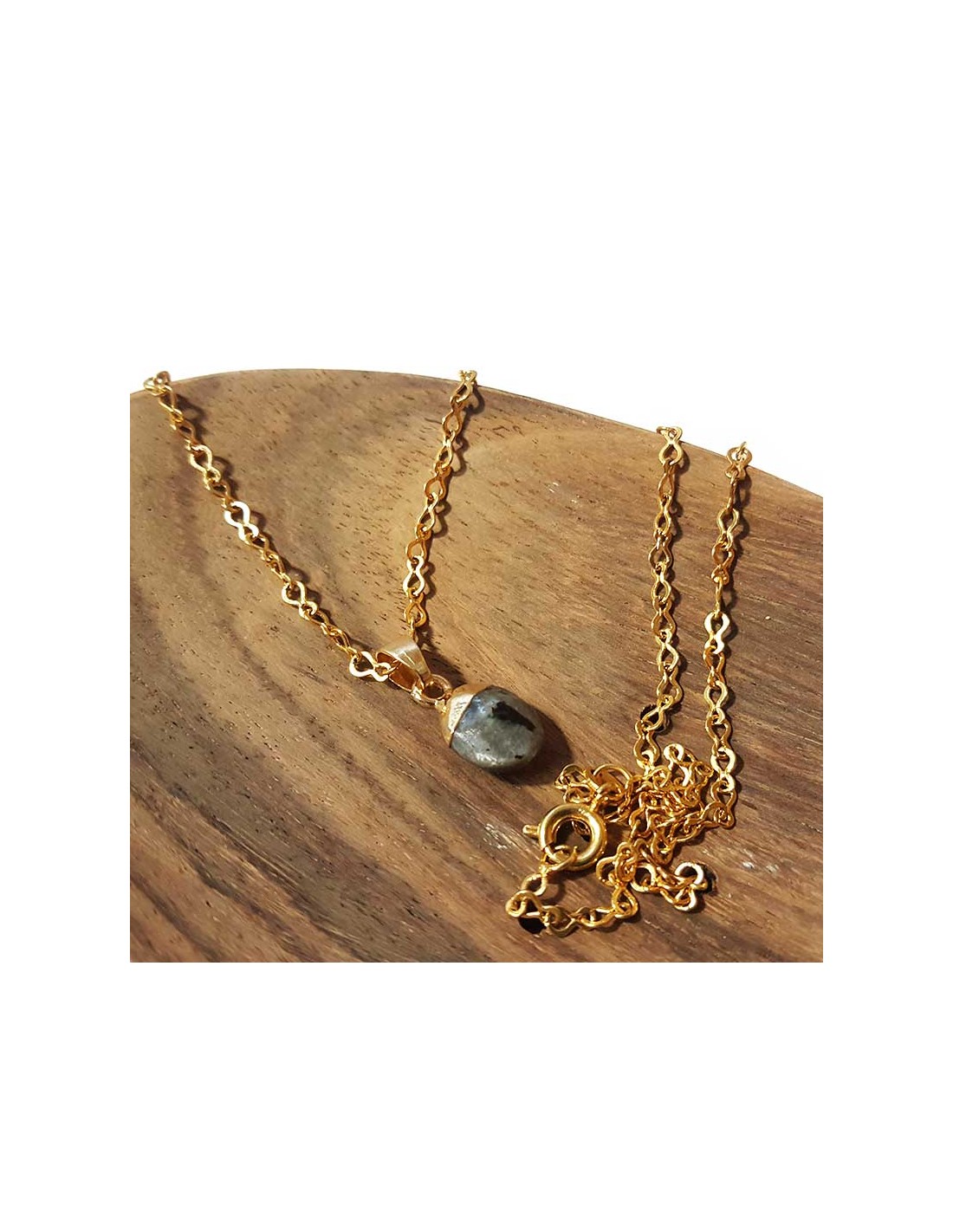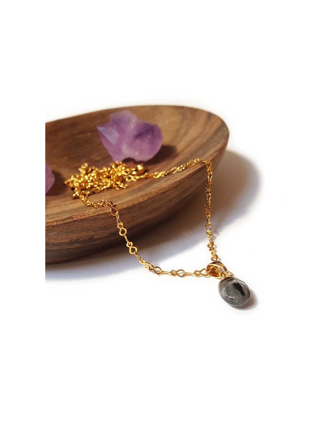 Deze labradoriet hanger is discreet en charmant. De steen is bovenaan verguld, delicaat geslepen in een druppelvorm en facetgeslepen. De vergulde ketting is inbegrepen.